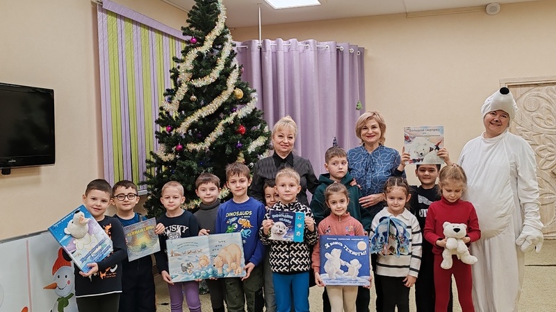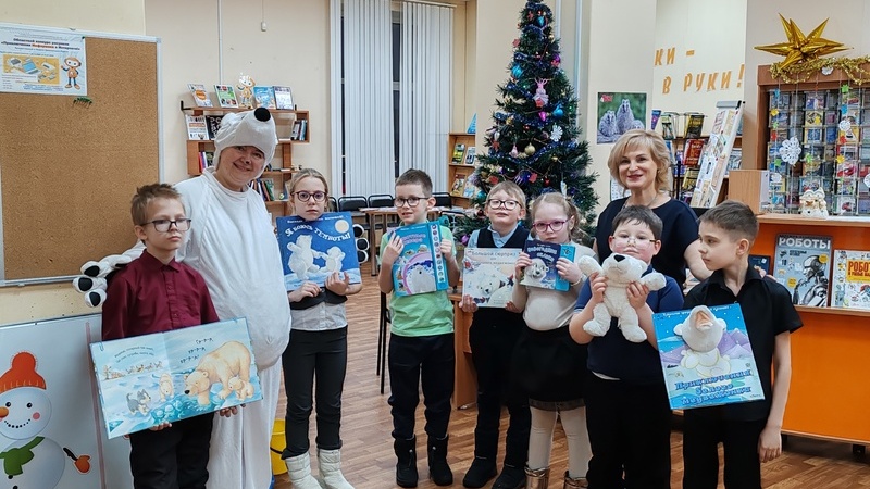 В конце встречи ребята все вместе сфотографировались на память о встрече с Мишкой и говорящей Ёлочкой. На книжной выставке были представлены книги о белом медведе и ёлках.