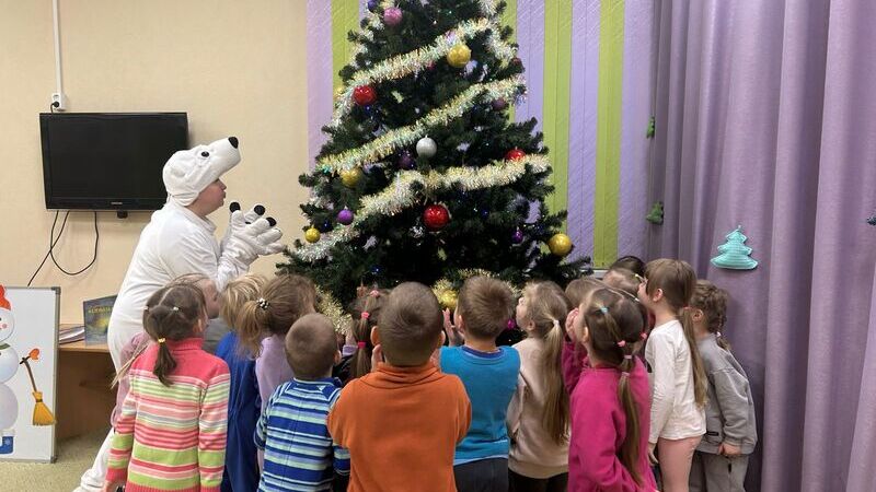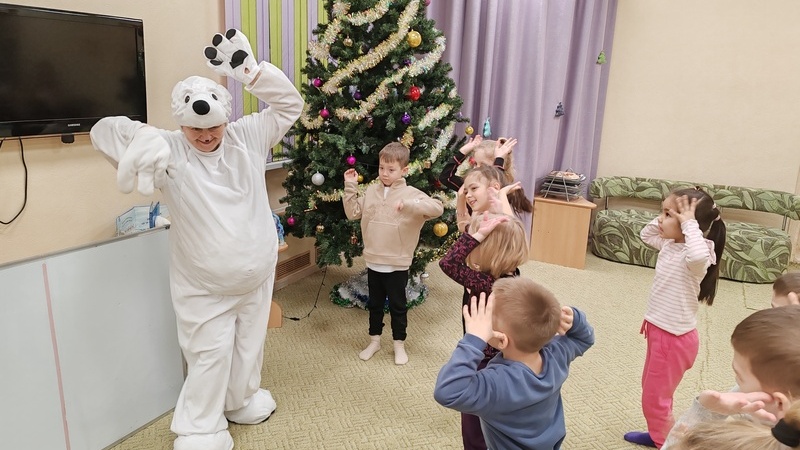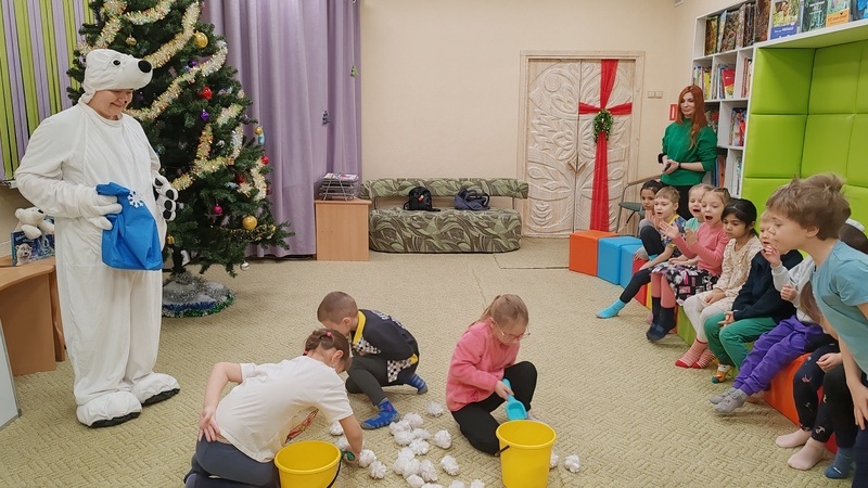 Добрый сказочный белый Мишка пригласил ребят в увлекательное путешествие, полное загадок, танцев, соревнований и сюрпризов. Дети отгадывали зимние загадки, танцевали, чтобы не «замёрзнуть», собирали совочками волшебные снежки, лепили снеговиков и даже отправились по «льдинам» на зимнюю рыбалку, чтобы угостить любителя рыбки его любимым лакомством.