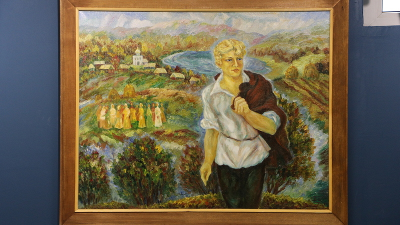Такой колоритной и праздничной является картина «Есенин», которую художник в год 130-летия со дня рождения поэта передал в дар Музею С. А. Есенина в Мурманской областной детско-юношеской библиотеке имени В. П. Махаевой.
