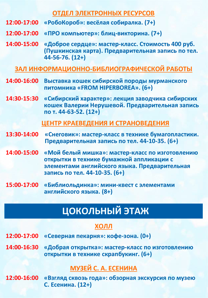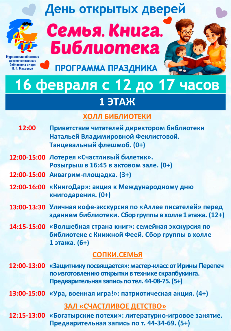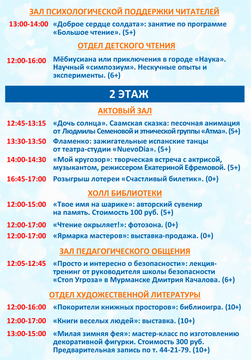 Сотрудники и партнеры библиотеки подготовили увлекательную программу, которая обязательно понравится читателям разных возрастов. По доброй традиции откроет семейный праздник директор библиотеки Наталья Владимировна Феклистова. После приветствия и совместного танца, зарядившись хорошим настроением, гости отправятся в увлекательное путешествие по различным залам библиотеки. Впервые пройдет уличная кофе-экскурсия по Аллее писателей – уникальному месту не только в Мурманске, но и в России. С ароматным напитком в руках участники прослушают увлекательную историю о жизни и творчестве известных писателей, чья судьба неразрывно связаны с Севером. Юных читателей и их родителей также ждет увлекательная экскурсия по библиотеке вместе с Книжной Феей. Все желающие смогут принять участие в акции «КнигоДар», приуроченной к Международному дню книгодарения.