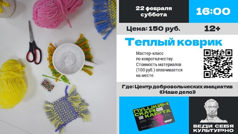Посетители совершат небольшой экскурс в историю появления старинного художественного промысла и создадут необыкновенно мягкий уютный коврик. Особые умения и навыки не потребуются, под руководством опытного наставника можно сразу включиться в работу. Каждый участник получит миниатюрный станок для изготовления коврика и пряжу. Занимательный процесс ковроткачества понравится как детям, так и взрослым. Готовое изделие послужит прекрасным подарком для родных и близких. Его можно использовать в качестве оригинальной подставки для папиной кружки, маминой вазочки или украсить прикроватную тумбочку бабушки.