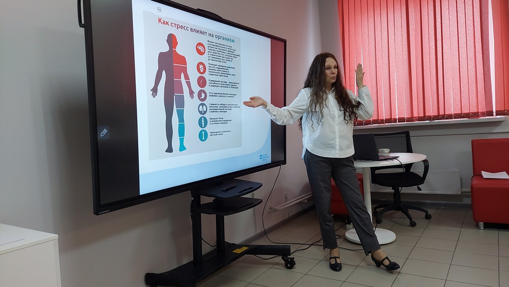 На все эти вопросы ответила приглашенный спикер Татьяна Михайловна Евтехова, специалист «Социального центра – SOS Мурманск». Она рассказала присутствующим о понятии стресса, о его видах и признаках, механизме возникновения и значении в жизни человека. Затем слушатели проделали несколько упражнений, которые могут помочь вывести человека из стрессового состояния и пробудить его жизненные силы. На прощание спикер дала несколько советов, как улучшить свое психоэмоциональное состояние и избежать впадения в хронический стресс.