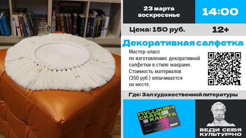 Количество мест ограничено. Материалы для работы оплачиваются отдельно. Их стоимость – 350 рублей. Оплатить можно в библиотеке любым удобным способом.