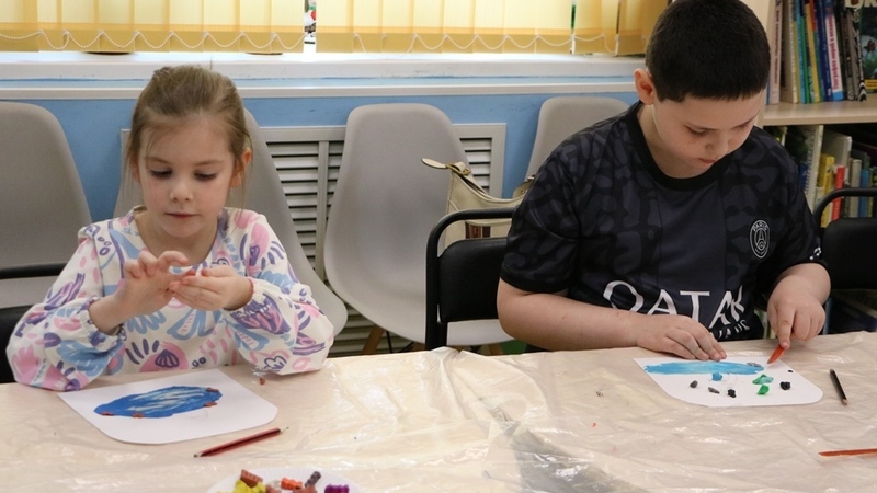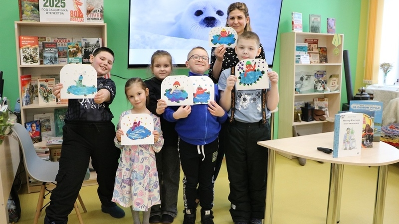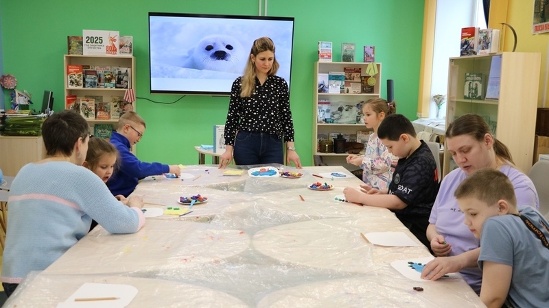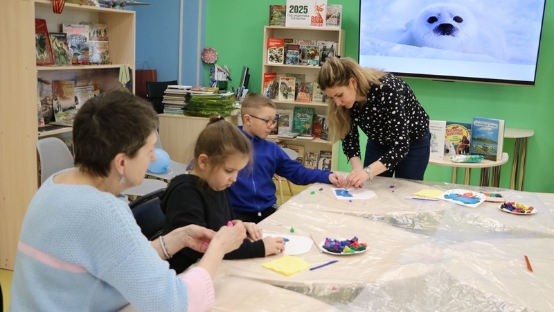 Под руководством библиотекаря дети смастерили панно из разноцветного пластилина, изобразив на нем белька на морском берегу. Мальчишки и девчонки усердно вылепливали голубую лагуну, камешки вокруг и главного героя праздника, нежащегося в волнах.