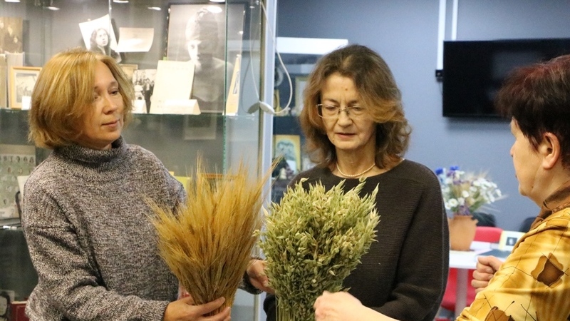 Мастерицы клуба пришли не с пустыми руками. В подарок Музею С.А. Есенина они преподнесли два необычных «букета»: снопы овса и ячменя, которые теперь украсят экспозицию.
