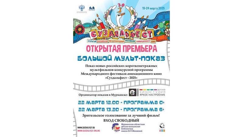В рамках XXX Открытого российского международного фестиваля анимационного кино «Суздальфест» уже в тринадцатый раз пройдет широкомасштабная акция «Открытая премьера». В Мурманске фестивальные показы организует Детская киностудия «Яркое настроение».