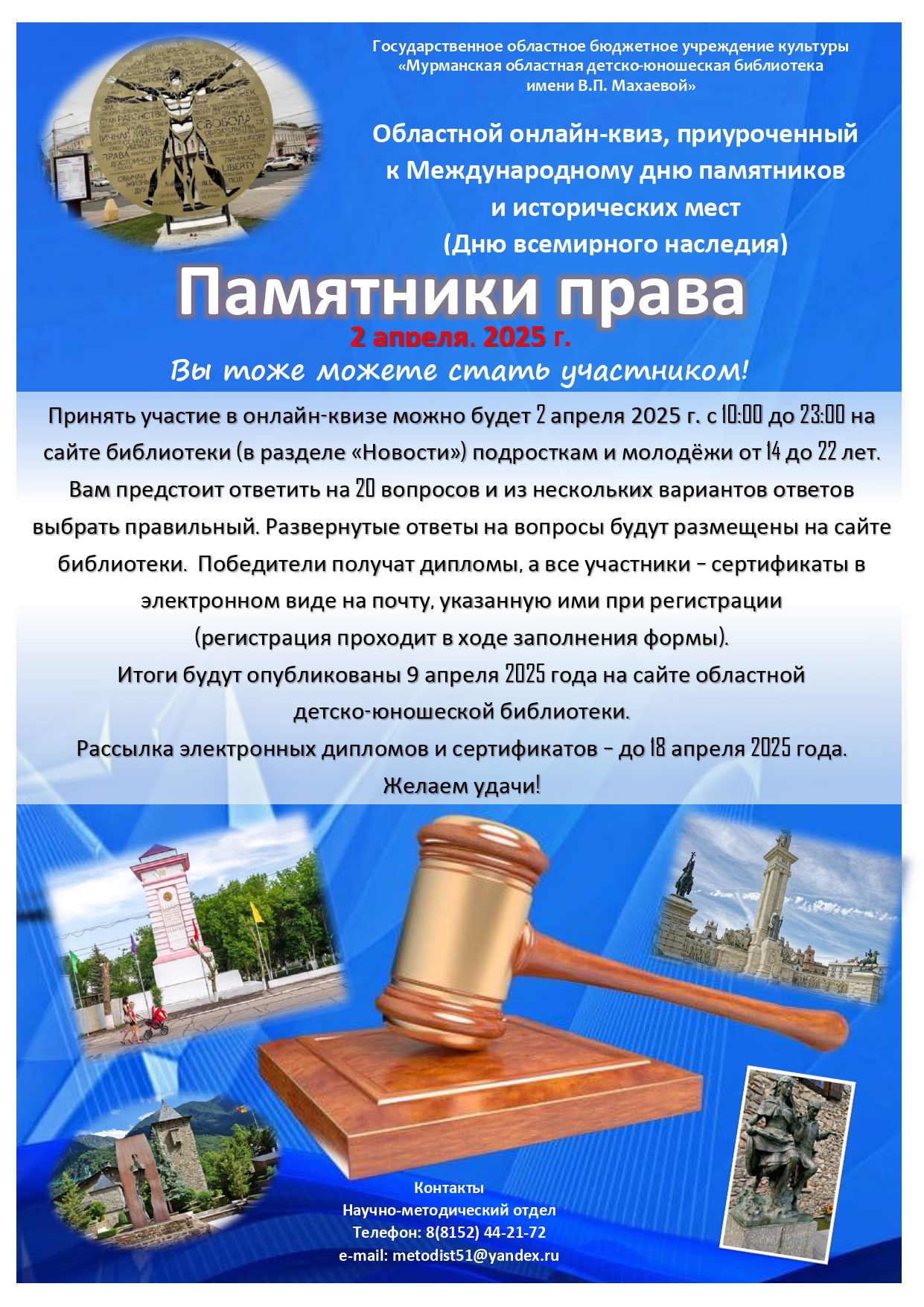 Для справки: Международный день памятников и исторических мест (День всемирного наследия) отмечается 18 апреля. Он установлен в 1983 году Ассамблеей Международного совета по вопросам охраны памятников и достопримечательных мест (ИКОМОС), созданной при ЮНЕСКО с целью привлечения внимания общественности к вопросам защиты и сохранения всемирного культурного наследия. Участвуя в мероприятии, подростки и молодёжь получат информацию об уникальных монументах и мемориальных комплексах, посвящённых Всеобщей декларации прав человека, конституциям разных стран, необычных памятниках права.