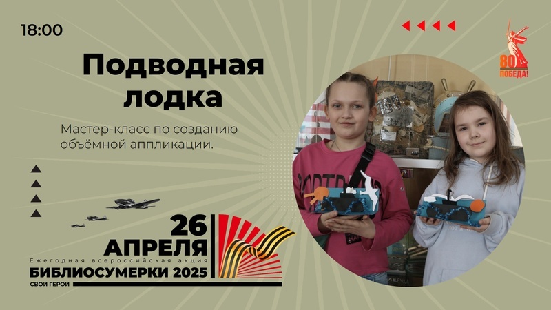 На творческом занятии поговорим о моряках-подводниках, которые охраняют нашу Родину под водой, и создадим объёмную аппликацию морского военного корабля – субмарины. Будем работать с цветной бумагой и картоном, клеем и ножницами. Все необходимые материалы предоставляются.