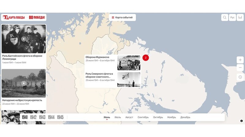 «Карта Победы» позволяет увидеть хронику Великой Отечественной войны, фотографии и научные статьи, посвященные военной тематике в привязке к городам и странам, на территории которых происходили события военной эпохи.