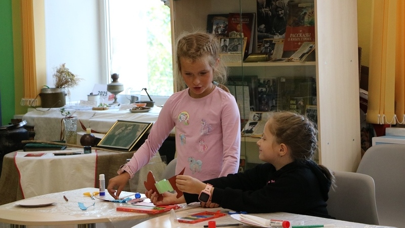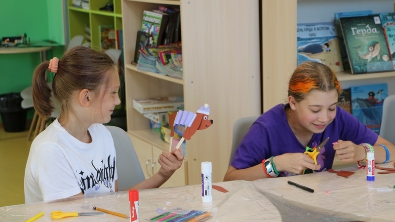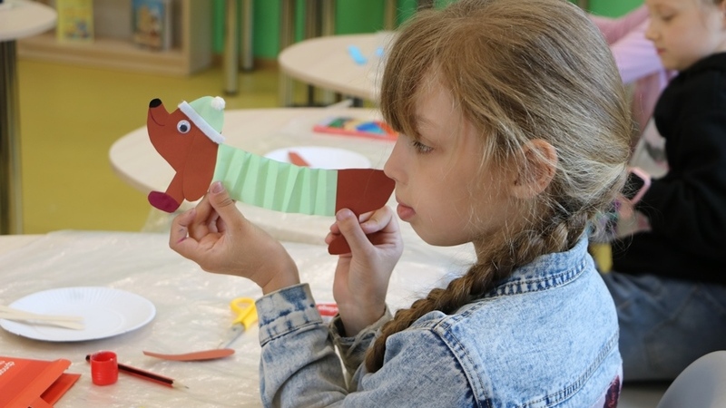 Далее участники приступили к созданию поделки. Для работы потребовался коричневый картон, цветная бумага, ножницы, клей, фантазия и немного терпения. По трафарету вырезали, а затем соединили все части, украсили белыми полосками фетра и приклеили палочки от мороженого. У ребят получились непохожие друг на друга таксы, каждая со своим характером. В завершение встречи дети придумали им имена и с удовольствием играли с новыми питомцами.
