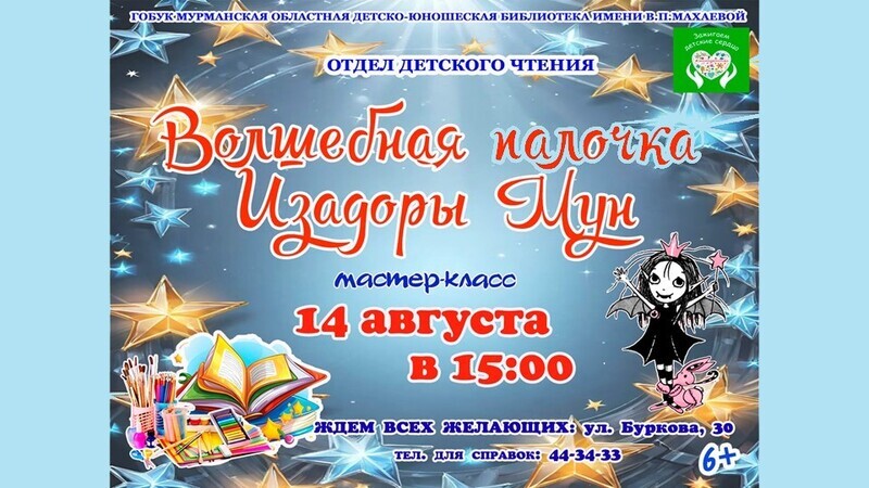 Если ваш ребенок любит волшебство так же как необычная девочка Изадора Мун, придуманная английской писательницей Гарриет Манкастер, спешите записаться на необычное занятие. Только 14 августа участники смогут превратиться в настоящих волшебников! Ребята узнают, что быть не таким, как все, не всегда просто, но очень интересно! А еще под руководством библиотекаря каждый сделает волшебную палочку, и, кто знает, возможно с ее помощью превратится в настоящего волшебника и сможет заколдовать кого угодно!