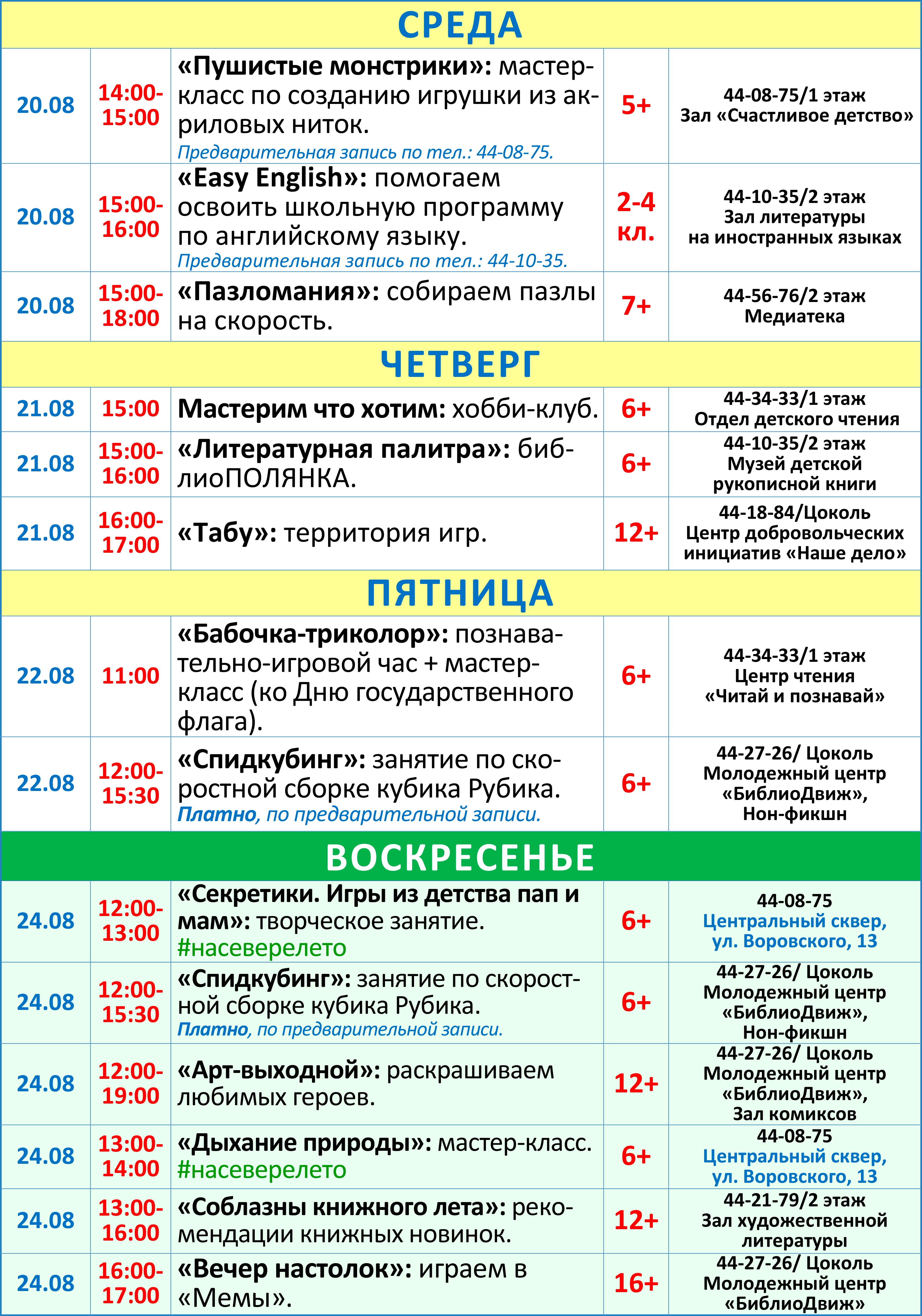 Обратите внимание – на некоторые мастер-классы необходима предварительная запись. В программе возможны изменения. Уточняйте, пожалуйста, информацию по указанному в афише телефону.