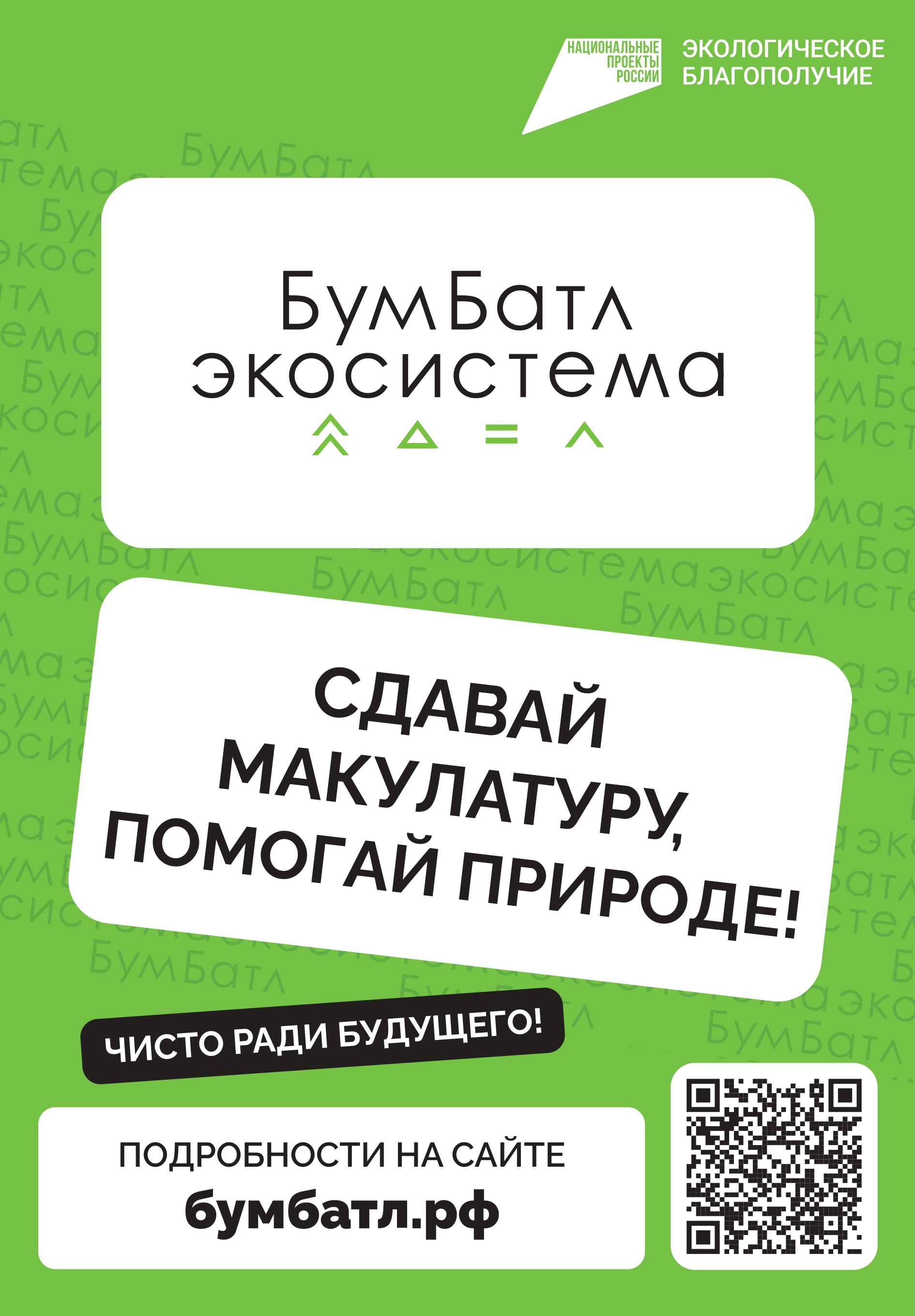 «БумБатл» — это Всероссийская акция по сбору макулатуры в поддержку национального проекта «Экологическое благополучие», который реализуется по решению Президента. Акция проходит под эгидой Всероссийского экологического общественного движения «Экосистема». «БумБатл» дает возможность проявить заботу о природе через сбор и сортировку бумаги. Но, как и любой батл, — это еще и соревнование по количеству собранной макулатуры, где можно побороться за первенство в командном или индивидуальном зачете, а также помочь своему региону стать лучшим по итогам года.