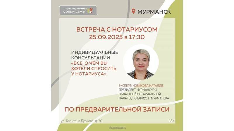 25 сентября в 17:30 в пространстве СОПКИ.СЕМЬЯ пройдет уникальная встреча и бесплатная консультация от опытного нотариуса. Мероприятие проводится Мурманской областной нотариальной палатой в рамках губернаторского проекта «На Севере – малыш»