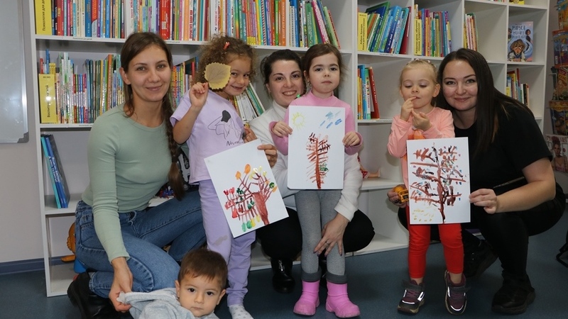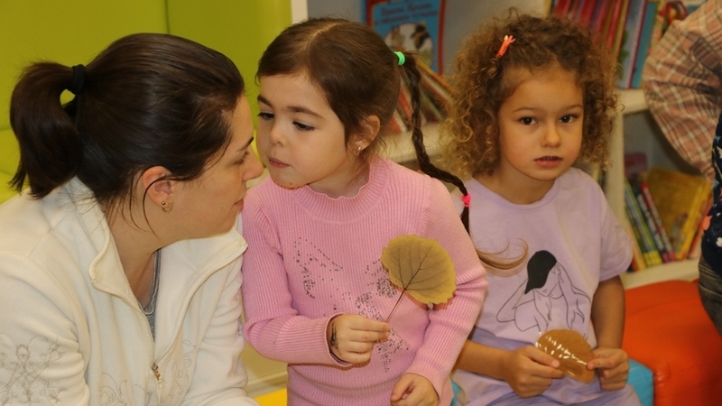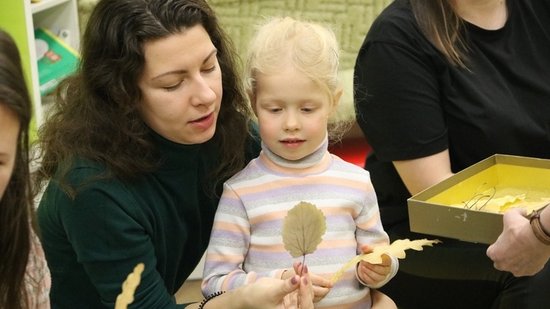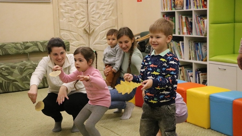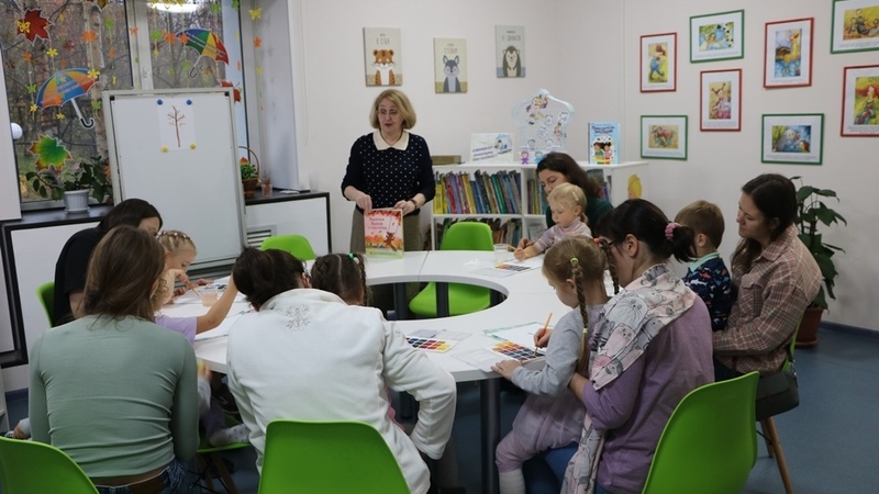 В творческой части занятия маленькие читатели рисовали любимое дерево лисёнка Лютера и играли с мамами в сказку, потому что к каждому малышу пришёл тот самый лисёнок и принёс в подарок красивый осенний листок.
