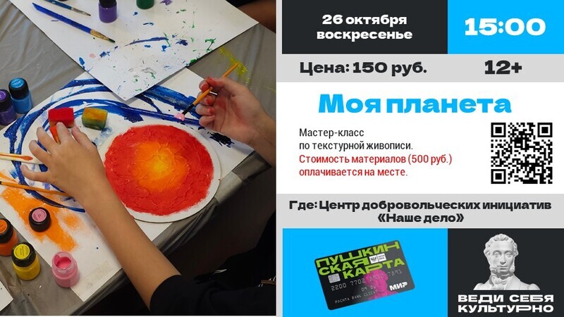 Участники увлекательного занятия научатся работать с акриловой краской, кистями и губками, узнают, как сделать объем и рельеф на декоративном панно. Первоначальные навыки рисования не требуются, опытные сотрудники помогут раскрыть фантазию и воплотить ее в реальность. Каждый сможет создать свою уникальную планету: кто-то с марсианскими просторами, а кто-то с глубокими реками и высокими горами. Панно будет оформлено в деревянной рамке и станет украшением дома или оригинальным подарком.
