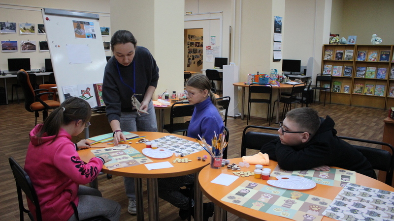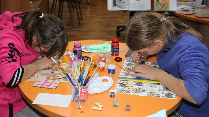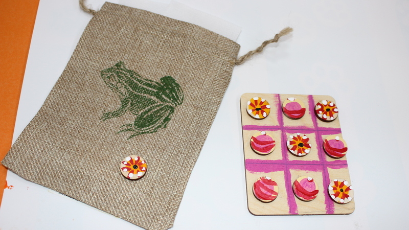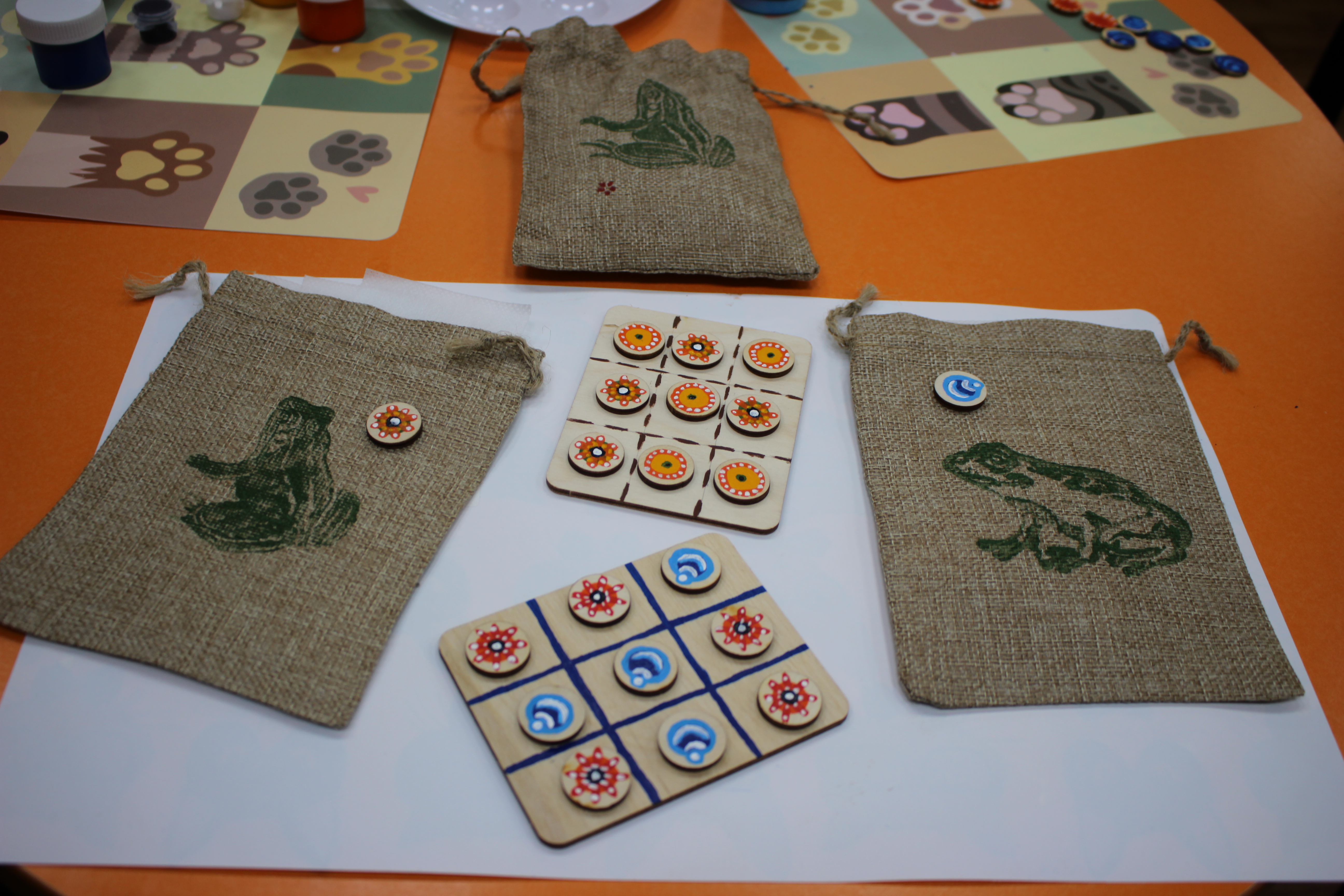 Каждый участник смог с помощью акриловых красок и деревянных штампов задекорировать льняной мешочек изображением героини русской народной волшебной сказки «Царевна-лягушка» и украсить фишки для игры яркими узорами городецкой росписи.