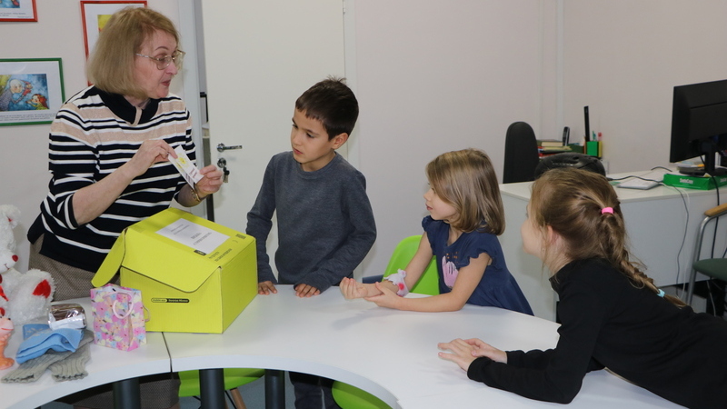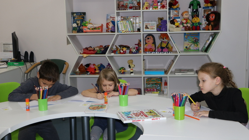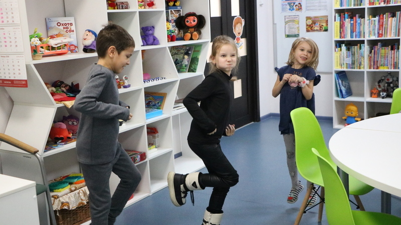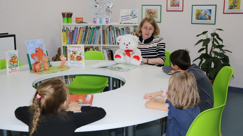 Ребят приветствовал белый мишка, который сказал им «самые прекрасные слова на свете», создав этим добрый настрой. В тёплой атмосфере зала друзья-читатели слушали отрывки из сказок Сергея Козлова «Трям! Здравствуйте!» и Григория Остера «Привет мартышке».