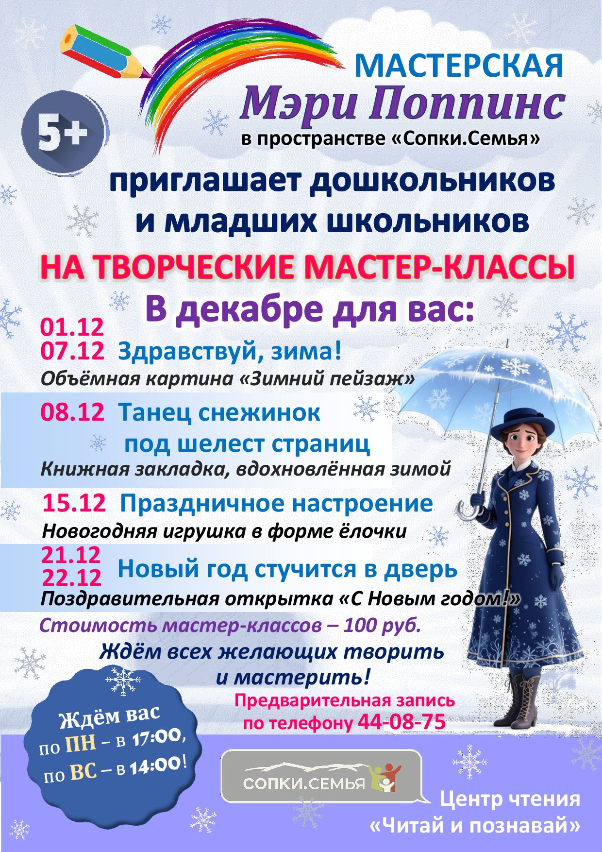 В пространстве СОПКИ.СЕМЬЯ в декабре по понедельникам, а иногда и в воскресенье, мы будем создавать своими руками прелестные поделки, связанные с зимой и грядущими праздниками. Окунитесь в атмосферу волшебства и творчества вместе с нами! Создайте подарки, открытки, картины, закладки, которые украсят ваш дом и порадуют близких.