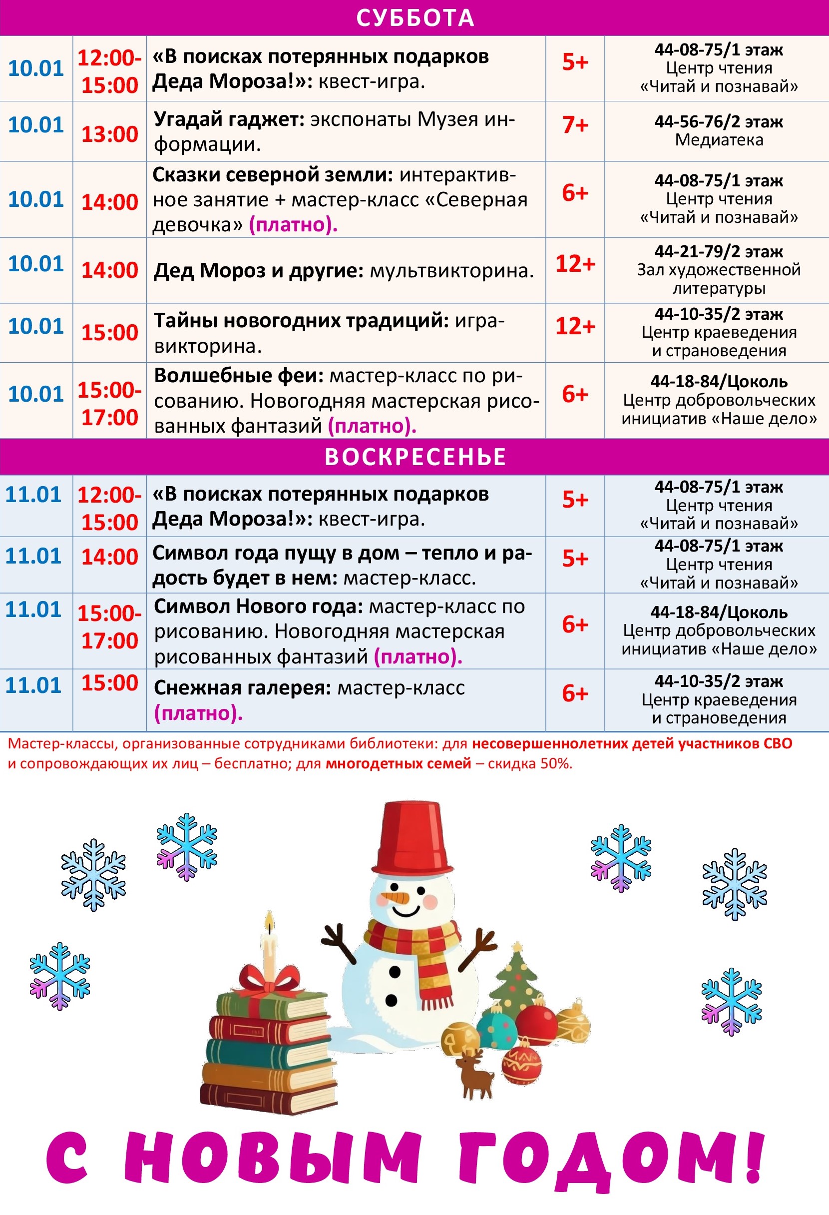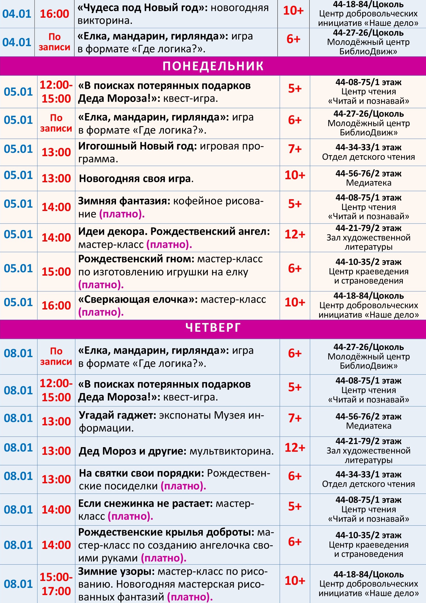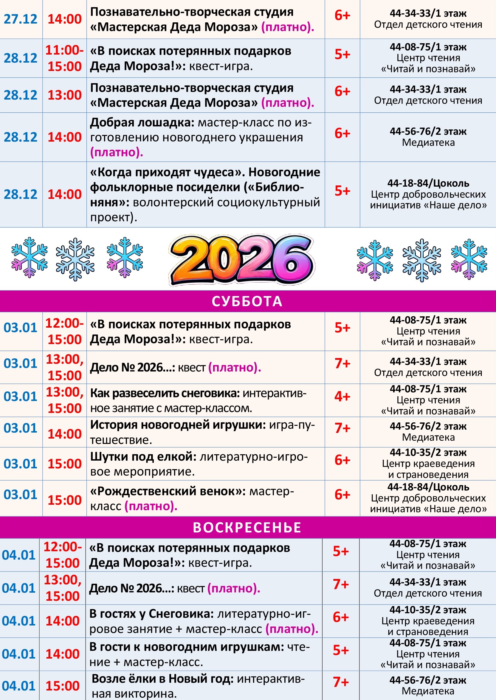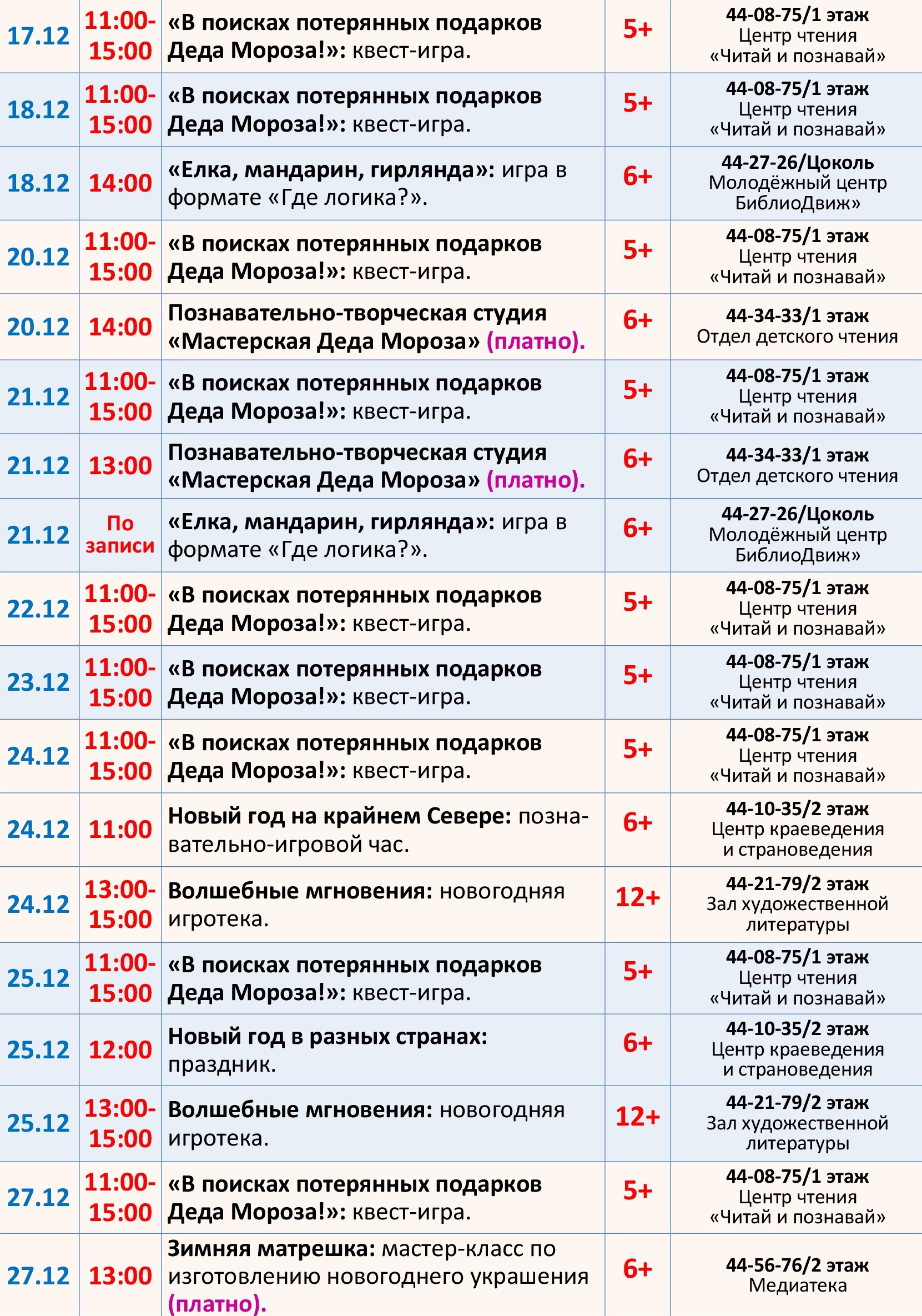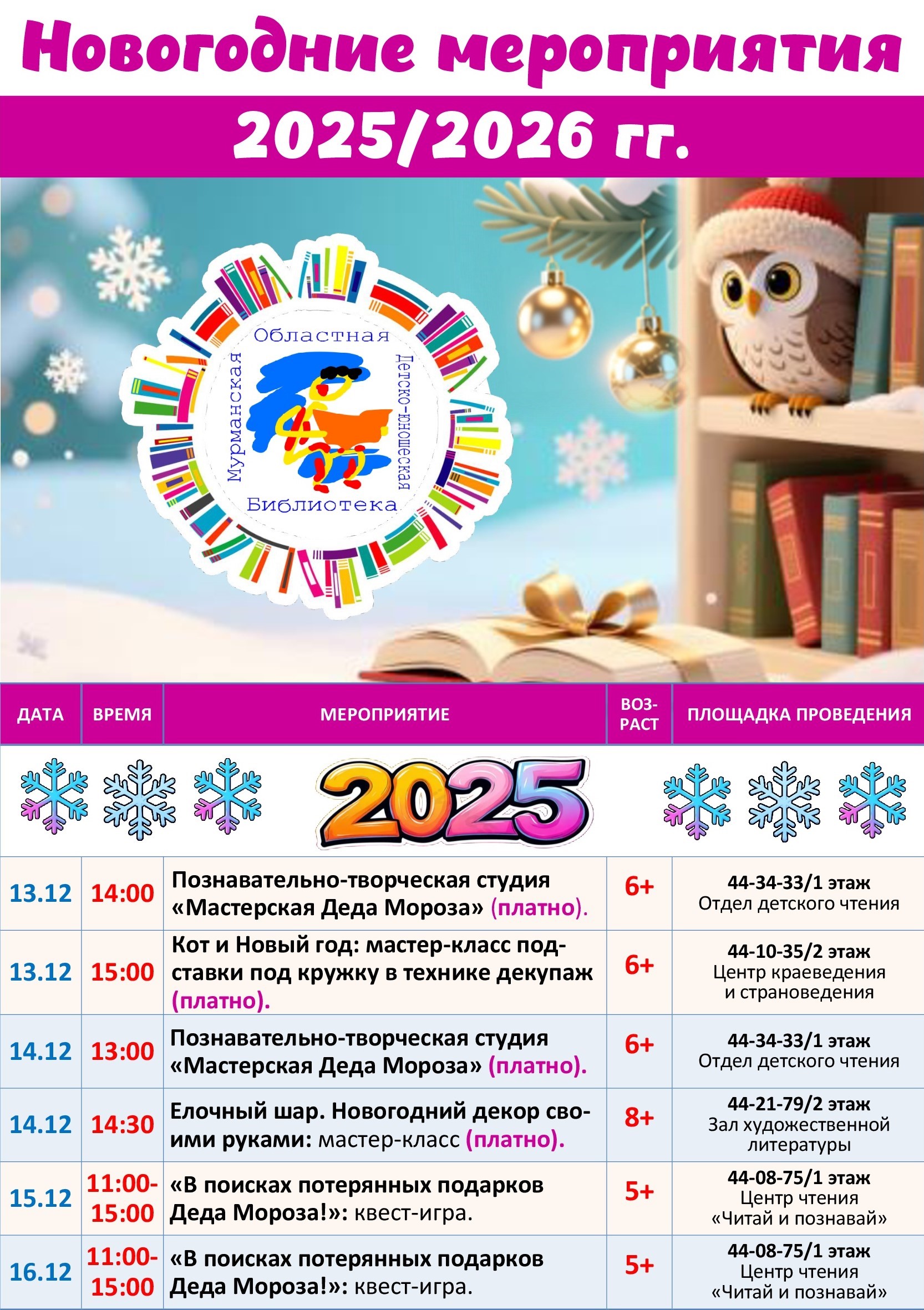 Приглашаем в детско-юношескую библиотеку на увлекательные новогодние мероприятия! В программе для вас творческие мастер-классы, познавательно-игровые встречи, увлекательные квесты, викторины и многое другое. Вы окунетесь в атмосферу волшебства, познакомитесь с новогодними традициями, сделаете подарки для близких и друзей, сфотографируетесь на память с хвойной красавицей и просто чудесно проведете время в кругу друзей.