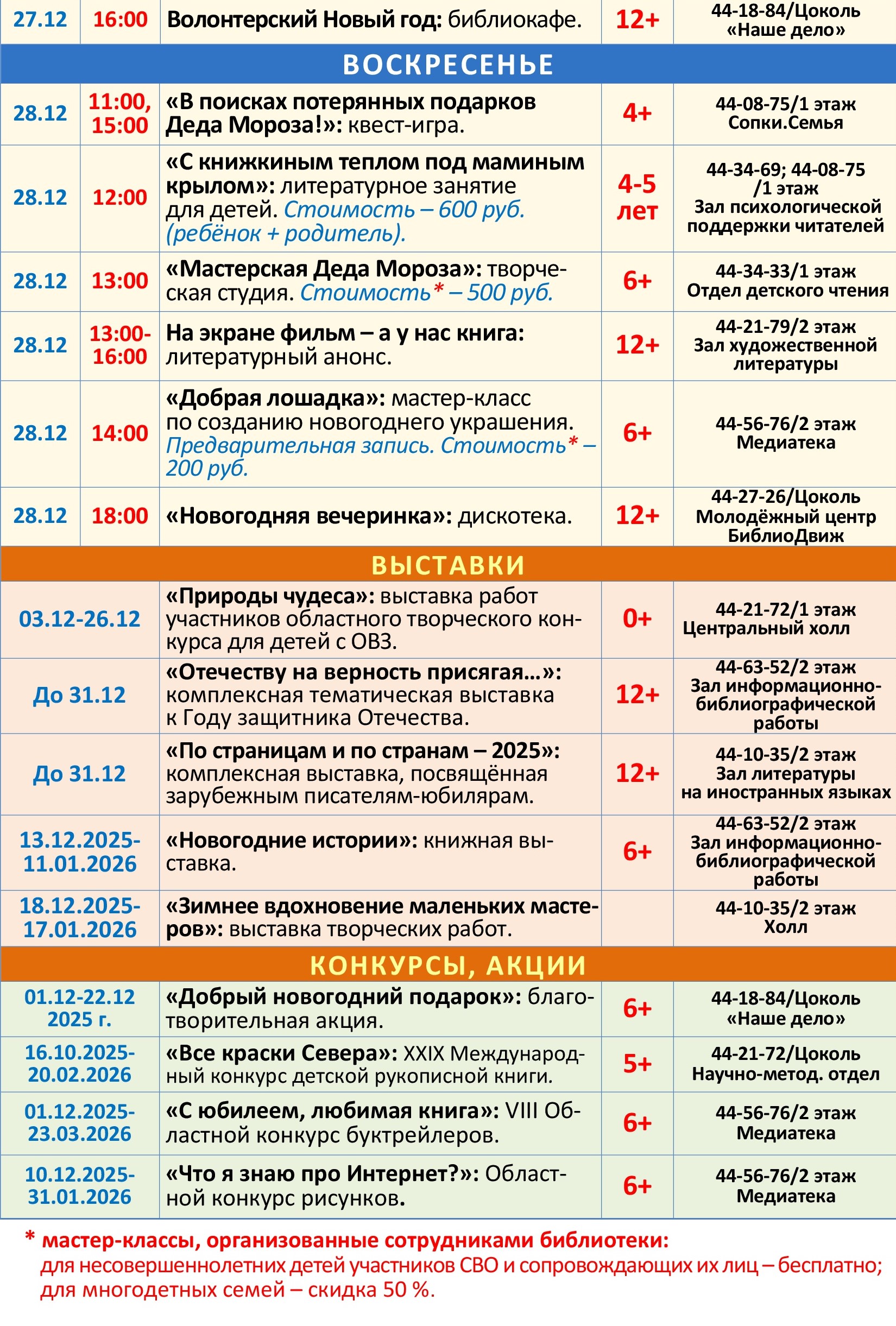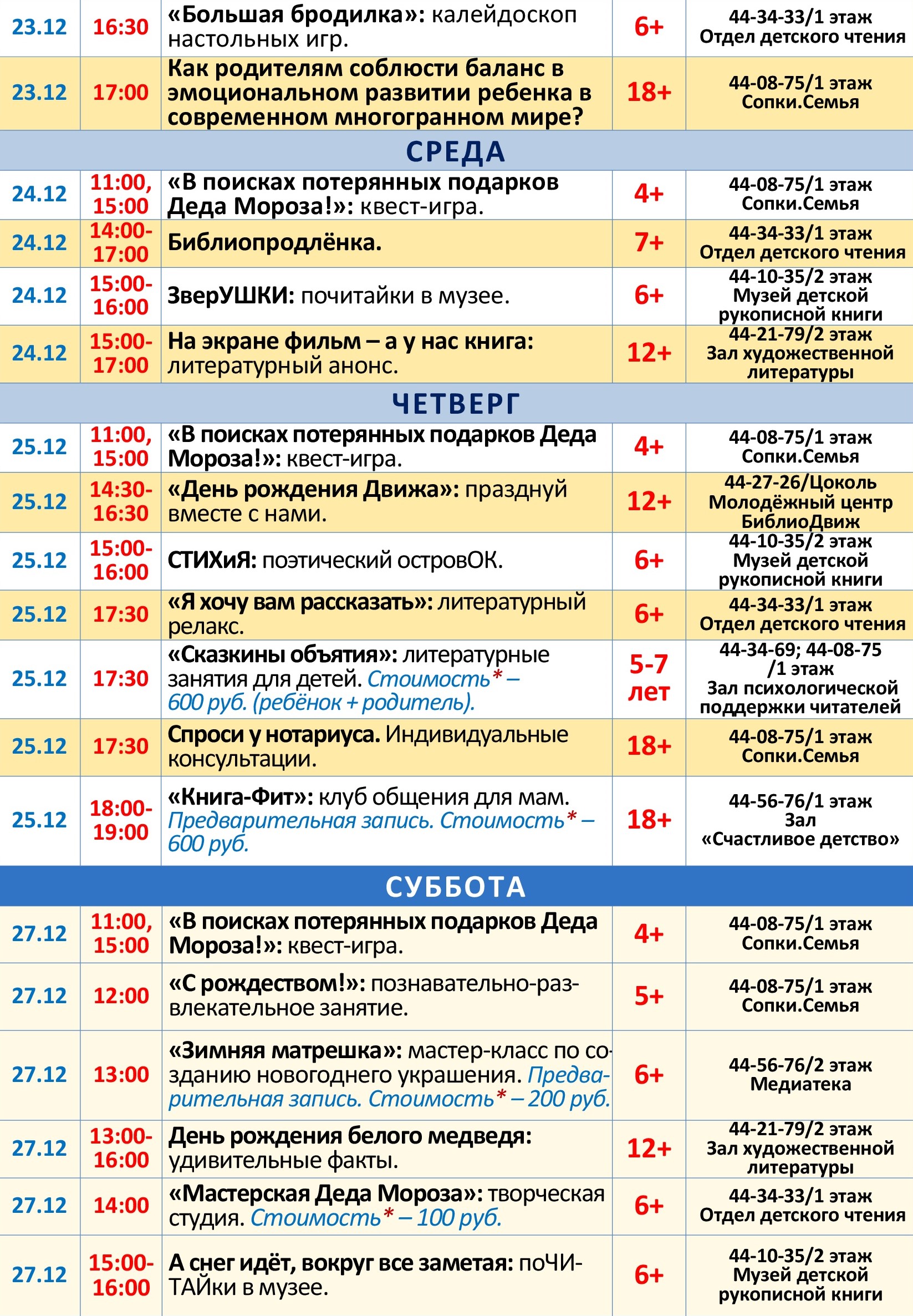 Обращаем внимание! На некоторые мастер-классы необходима предварительная запись. В программе возможны изменения. Уточняйте, пожалуйста, информацию по указанному в афише телефону.