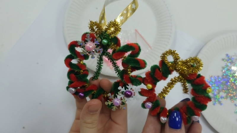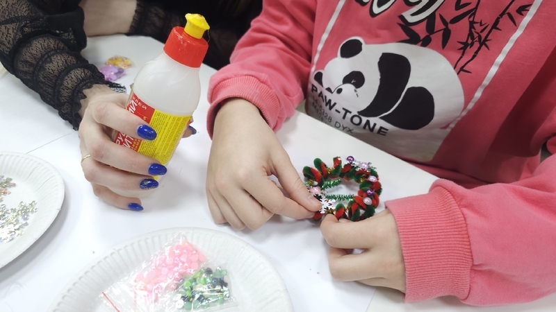 Участники мастер-класса «Рождественский венок» с радостью включились в увлекательный процесс: учились работать с синельной проволокой и создавали праздничные поделки. Этими чудесными украшениями ребята украсят свои новогодние ёлочки.