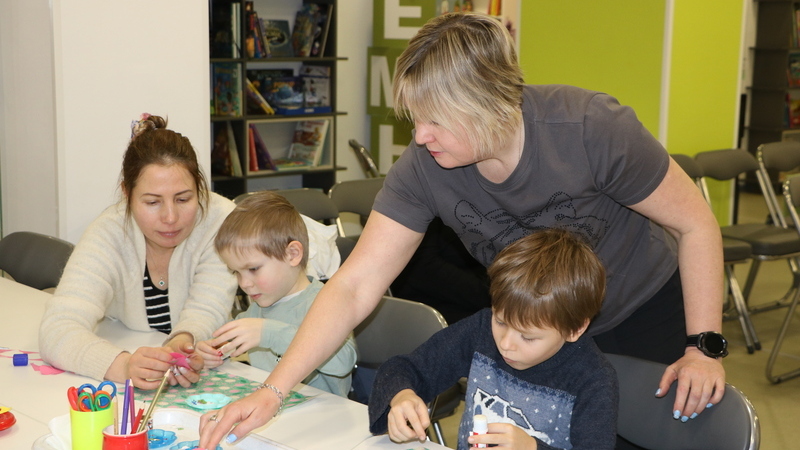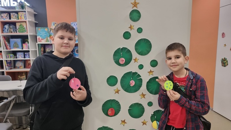 Участники искали снежинку и пришнуровывали ее к книжке, находили фигурку Деда Мороза, которая исчезла из книги, искали книги – вырубки в виде елочки, угадывали самые чудесные новогодние запахи в арома-книжке и мастерили подарки – елочные шарики для нашей елочки!
