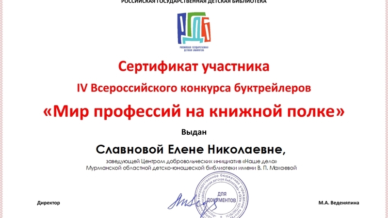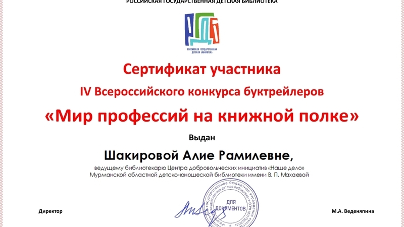 Организатором выступила Российская государственная детская библиотека. Всего на конкурс прислали 238 работ из разных регионов России. Славнова Елена Николаевна и Шакирова Алия Рамилевна представили буктрейлер по книге Ольги Голотвиной «Библиотека тетушки Марты».