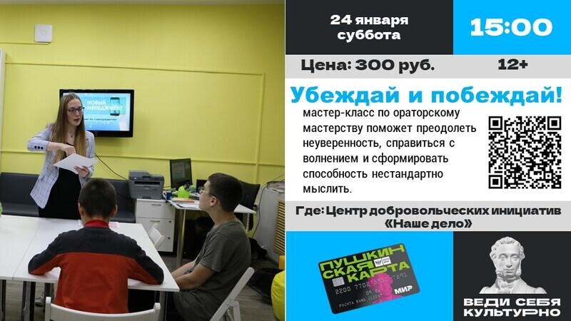 На мероприятии участники научатся бороться с волнением перед выходом на публику, подберут свою идеальную позу оратора, которую в будущем смогут использовать во время публичных выступлений, а также познакомятся с секретами известных спикеров. Практическое занятие поможет преодолеть неуверенность, справиться со страхом и сформировать способность нестандартно мыслить в самых неожиданных ситуациях. Количество мест ограничено.