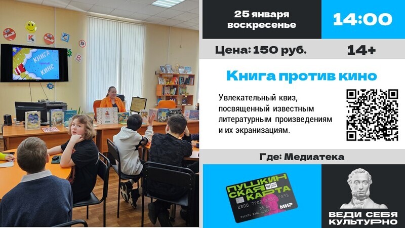 Медиатека приглашает подростков и молодежь от 14 лет на увлекательную викторину, посвященную известным литературным произведениям русской классики из школьной программы и их экранизациям.