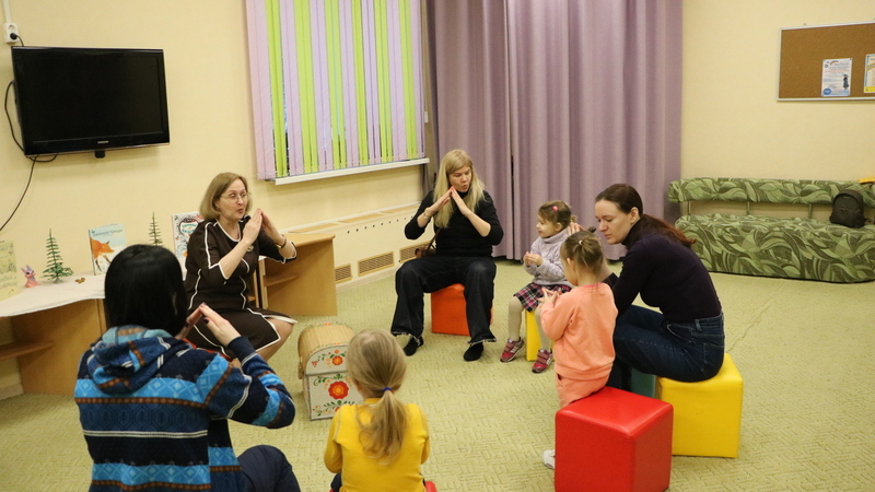 Малыши вместе с мамами с интересом слушали и смотрели небольшую уютную и атмосферную историю «Зимние танцы» М.Д. Брауэра. «Зимой столько разных дел! Прятать орешки, улетать на юг, впадать в спячку до весны. Но ни одно из этих занятий рыжему лису не подходит. Что же он будет делать зимой?».