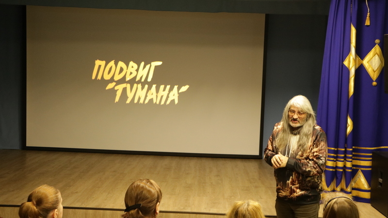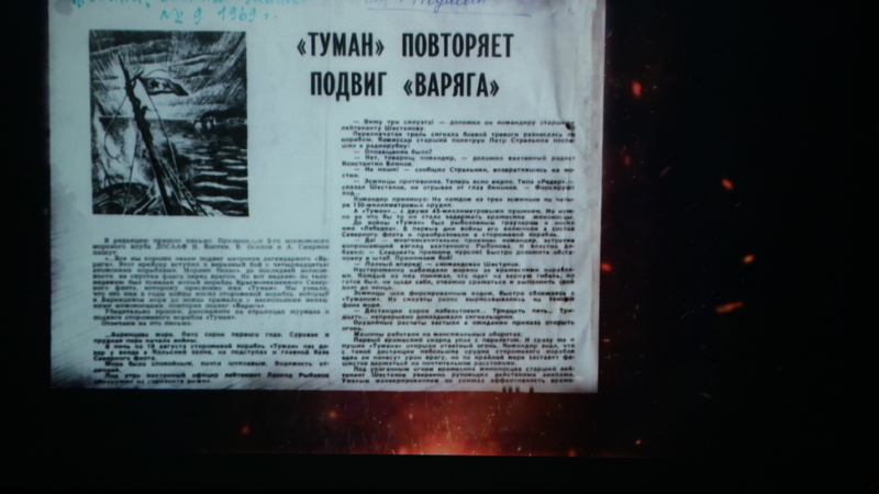 В продолжении рассказа в мультимедийном зале библиотеки состоялся показ документального фильма Андрея Сычёва «Подвиг "Тумана"» о подвиге сторожевого корабля «Туман» (бывший рыболовный траулер РТ-10 «Лебёдка»), который погиб 10 августа 1941 года во время боевого дежурства на линии остров Кильдин — мыс Сеть-Наволок. Под обстрелом вражеской артиллерии экипаж «Тумана» до последней возможности самоотверженно сражался и боролся за выживаемость судна, не спуская военно-морской флаг Северного флота.