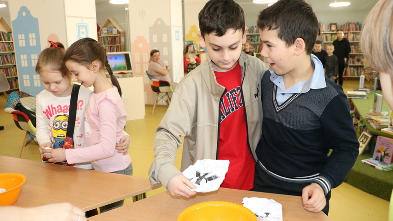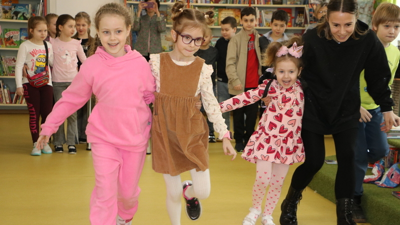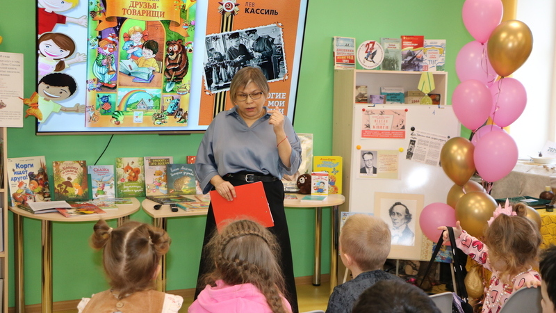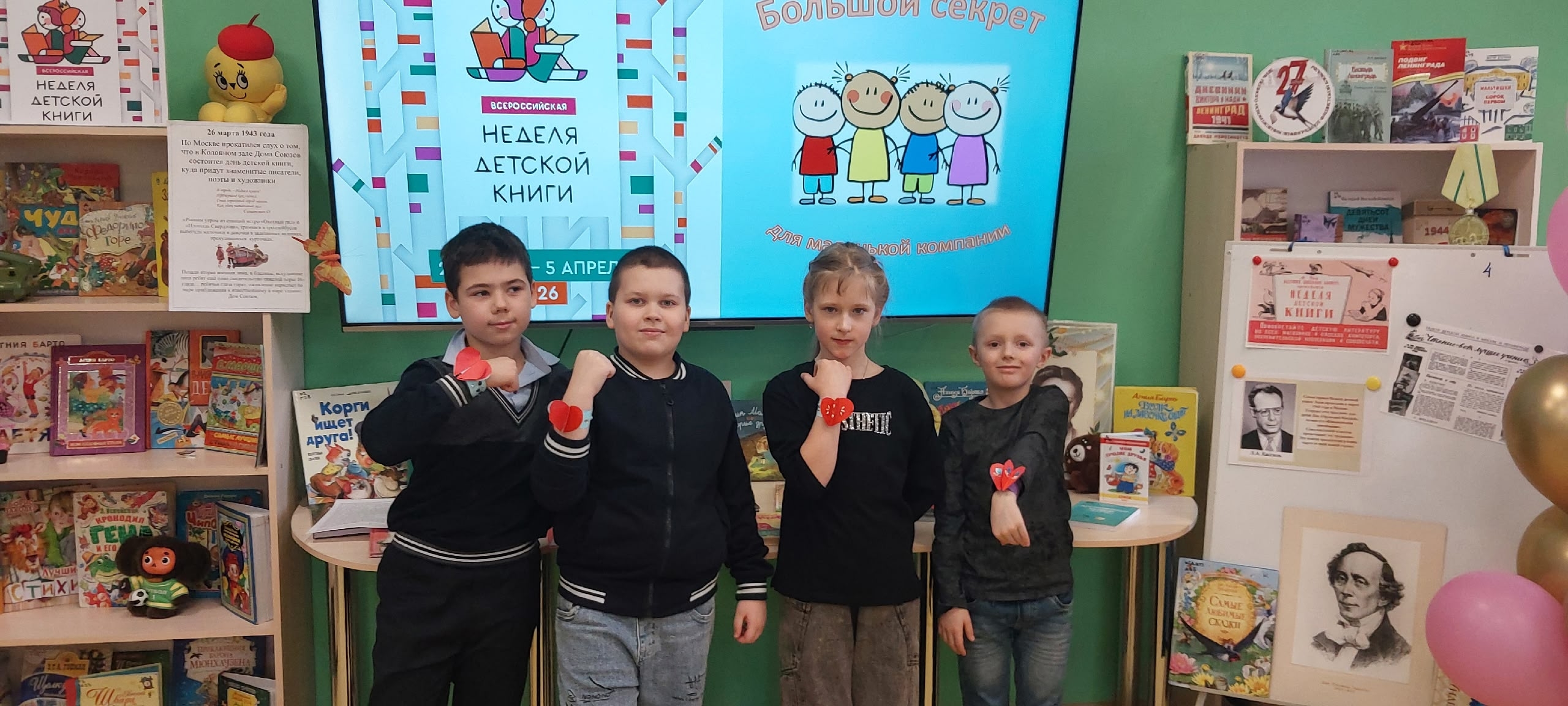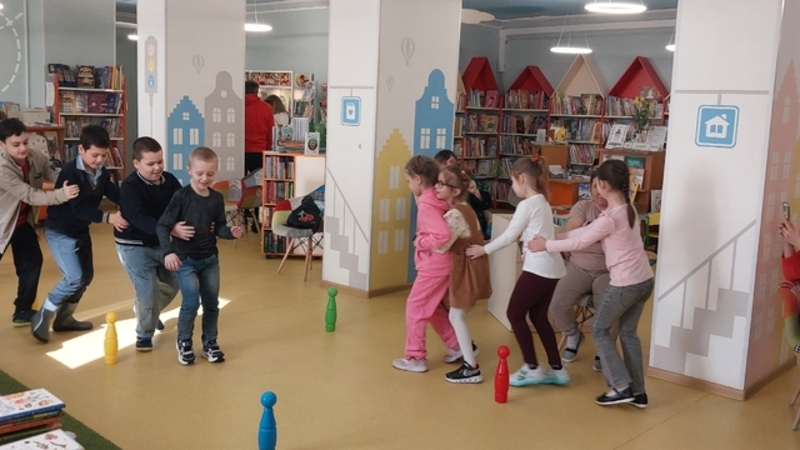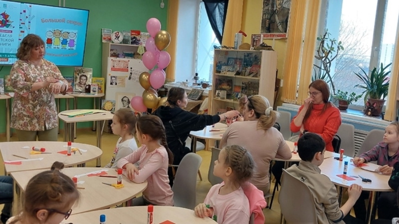 Шумной, озорной и дружной компанией участники отправились в медиапутешествие по истории Книжкиной недели. Узнали, кто стоял у ее истоков, познакомились с авторами – юбилярами 2026 года. Поговорили о том, что такое дружба, чем можно заняться вместе, вспомнили книжных героев – настоящих друзей. После, построившись по росту, цвету волос, первым буквам имени, гости разбились на команды и доказали, что дружно могут справиться с любой задачей: спасали от городского «дворника» слово на смятых бумажных листах, подставляли плечо товарищу, преодолевая «городские серпантины», и даже со связанными руками смогли построить дом. А затем веселым паровозиком отправились мастерить особенный браслет.