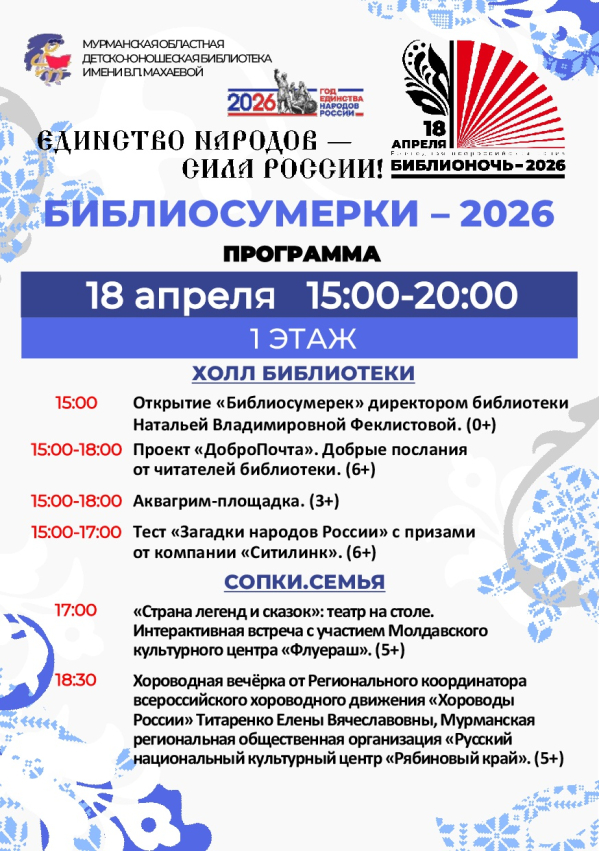 Друзья, уже совсем скоро 18 апреля с 15:00 до 20:00 в Мурманской областной детско-юношеской библиотеке имени В.П. Махаевой пройдут «Библиосумерки» в рамках Всероссийской акции «Библионочь – 2026».