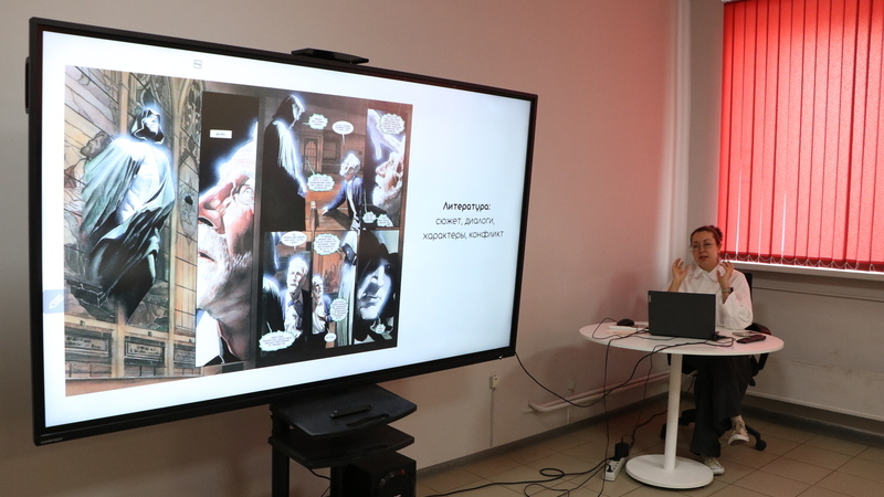 Выступление Александры Солтанбековой «Комиксы в действии» было посвящено конкурсам комиксов как способу привлечения молодёжи к чтению. Она не только поделилась практическим опытом, но и предложила коллегам вместе разобраться, в чём феномен комикса. Итогом стало общее мнение: конкурсы рисованных историй – это не про развлечение, а про развитие читательского интереса и визуальной грамотности подростков.
