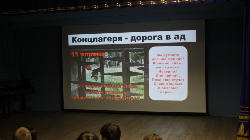 Из рассказа библиотекаря ребята узнали о фашистских лагерях смерти Бухенвальд, Дахау, Майданек, Хелмно, Саласпилс, Освенцим и других; о зверствах, которые творили фашисты над людьми, как их морили голодом, истязали побоями, непосильным трудом, пытками, убивали в газовых камерах, сжигали.