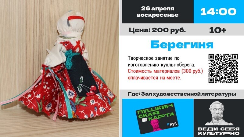Библиотекарь познакомит посетителей со славянскими традициями и обрядами, расскажет о технике изготовления куклы-мотанки. Затем участники приступят к созданию своей берегини. Основой платья послужит натуральный лен – благородный фактурный материал, который известен с древних времен. Для отделки одежды будут использованы деревянные элементы – бусины и декор, а также джут. Хлопковое кружево и красные нити добавят нежности образу. Ручная работа, натуральные материалы и добрые мысли, сопровождающие изготовление куклы, помогут зарядить ее положительной энергией. Берегиня станет прекрасным украшением интерьера, символом благополучия и защиты, создаст атмосферу уюта и тепла в доме.
