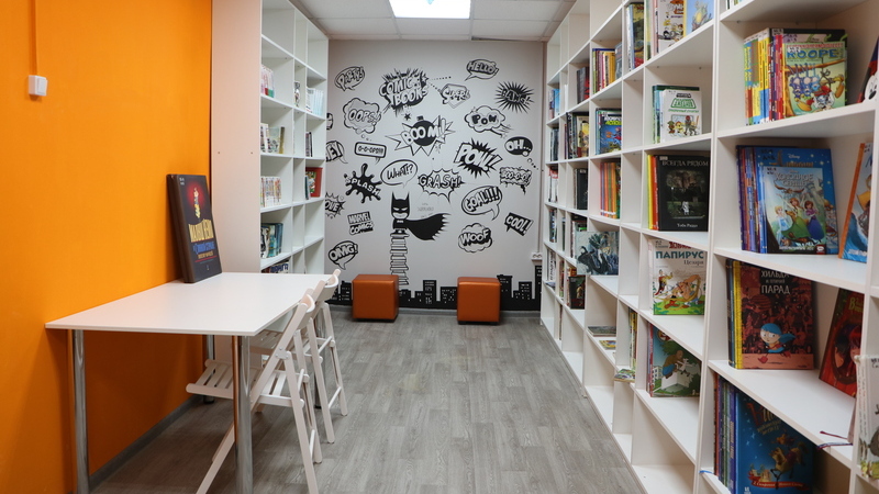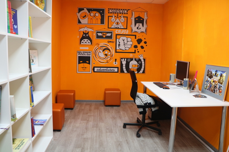 Небольшое помещение прямоугольной формы с яркими стенами оранжевого цвета без окон, с одностворчатой боковой дверью. Вместимость 5-8 человек. В помещении имеется стол, стулья, мягкие пуфики. 2 акцентные стены украшены рисунками в комикс тематике.