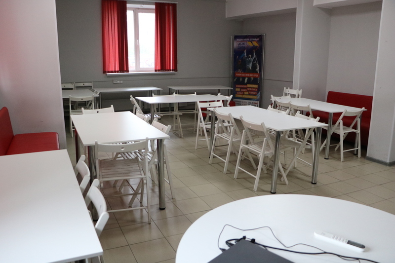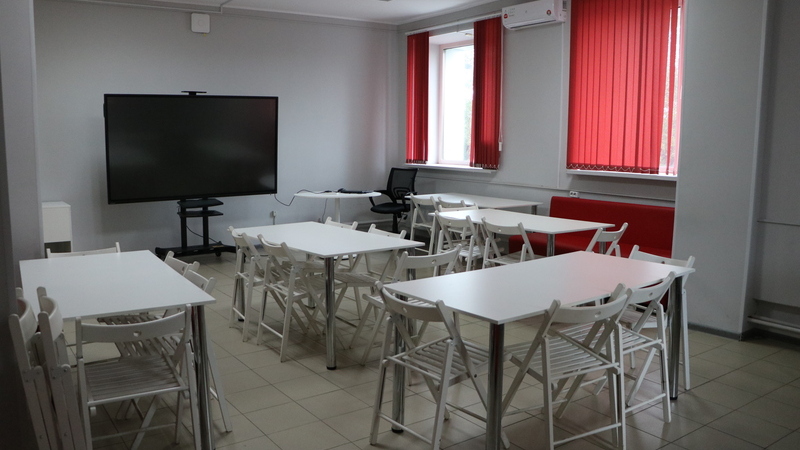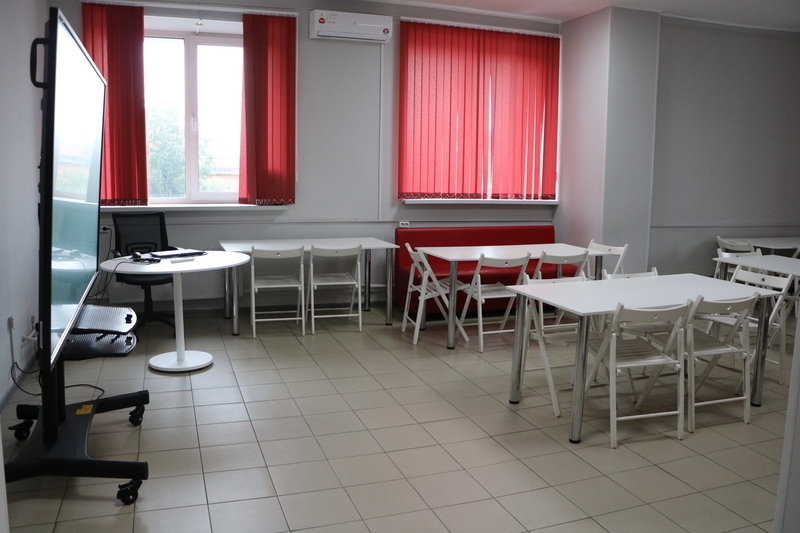Просторное обособленное помещение правильной прямоугольной формы с 3-мя окнами и двустворчатой входной дверью. В зале имеются столы, стулья, большой интерактивный экран, ноутбук. Есть возможность поставить флипчарт, а также подключить дополнительное оборудование.