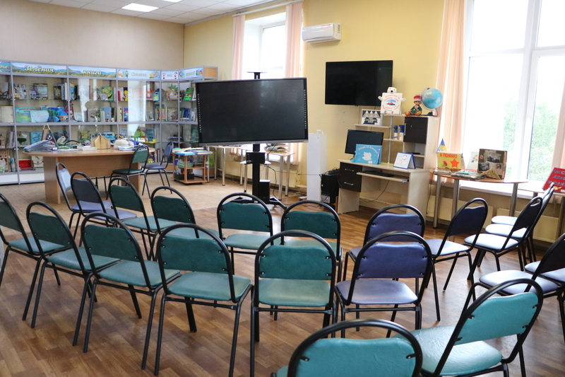 Просторное помещение прямоугольной формы без дверей, отгороженное от основного зала стеклянными витринами. Вместимость – до 40 человек. В помещение: программно-аппаратный образовательный комплекс передвижной, компьютер, телевизор LED, рециркулятор воздуха «Сфера». Есть возможность поставить флипчарт, книжные стеллажи, а также подключить дополнительное оборудование.