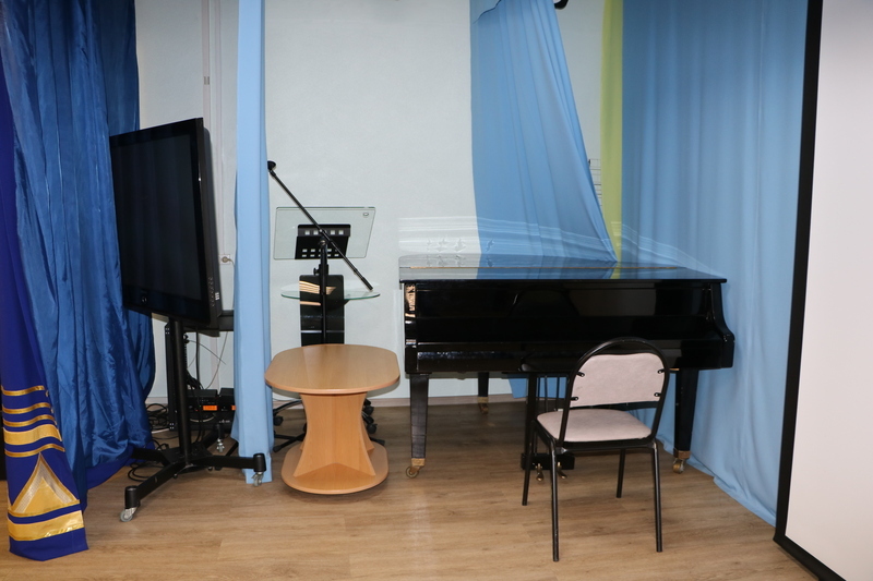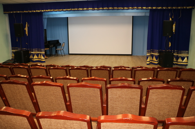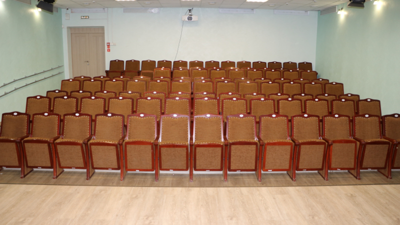 Просторное проходное помещение правильной прямоугольной формы с двустворчатой входной дверью и с боковой дверью для выхода на сцену. Вместимость — до 98 человек (2 из них – места для инвалидов). В помещении есть сцена, осннащенная раздвижными шторами, на сцене – рояль, кафедра для выступающего, телевизор на стойке на колесиках; прожекторы, кондиционер, проектор и 2 моторизированных экрана (за сценой, перед сценой), музыкальный микшерный пульт, акустическая система, микрофоны и стойки к ним, презентер; есть возможность поставить флипчарт, стеллаж с книгами, столик с креслами для гостей на сцене. Слева от сцены расположено рабочее место с персональным компьютером и ноутбуком для управления светом.