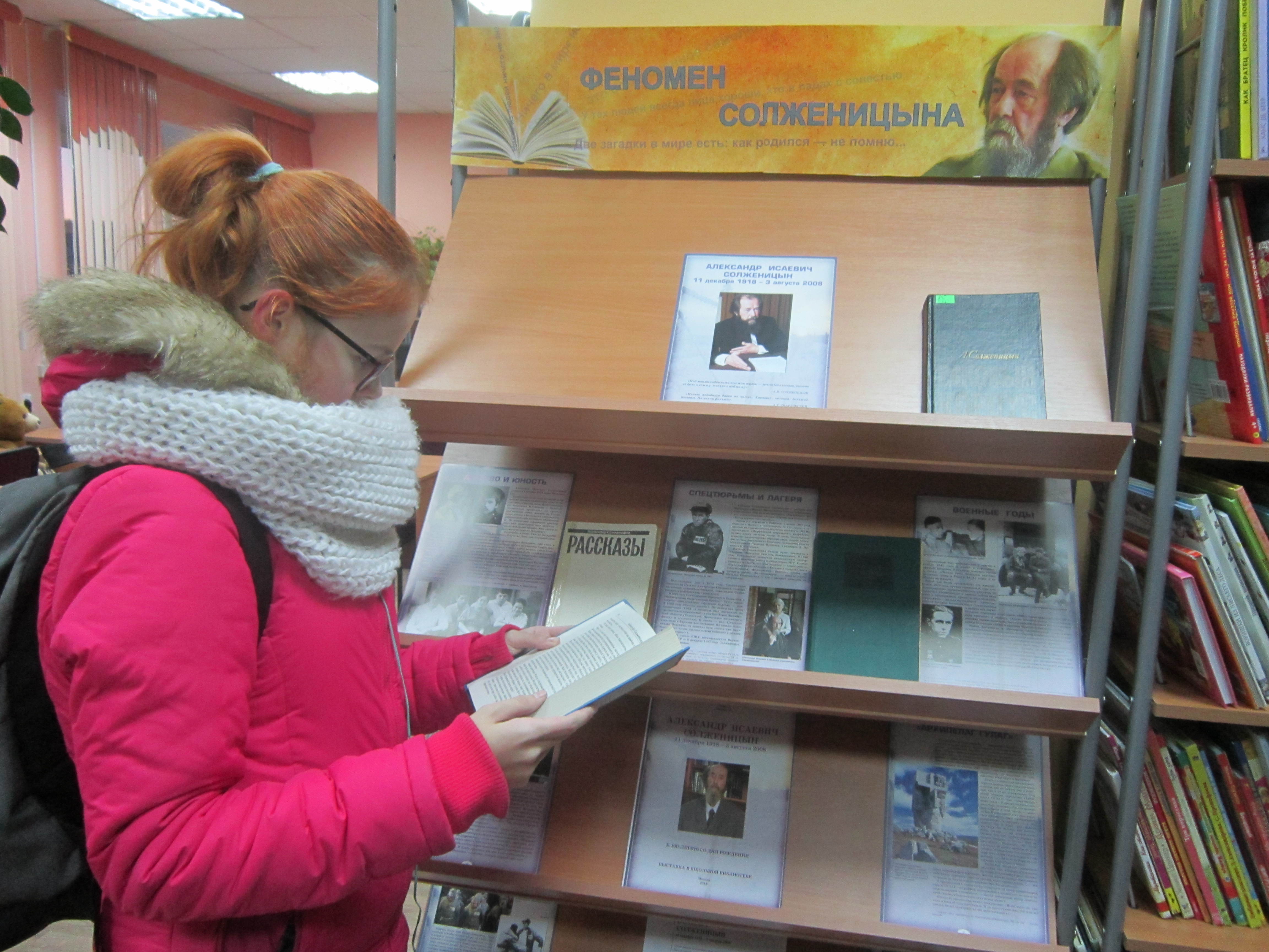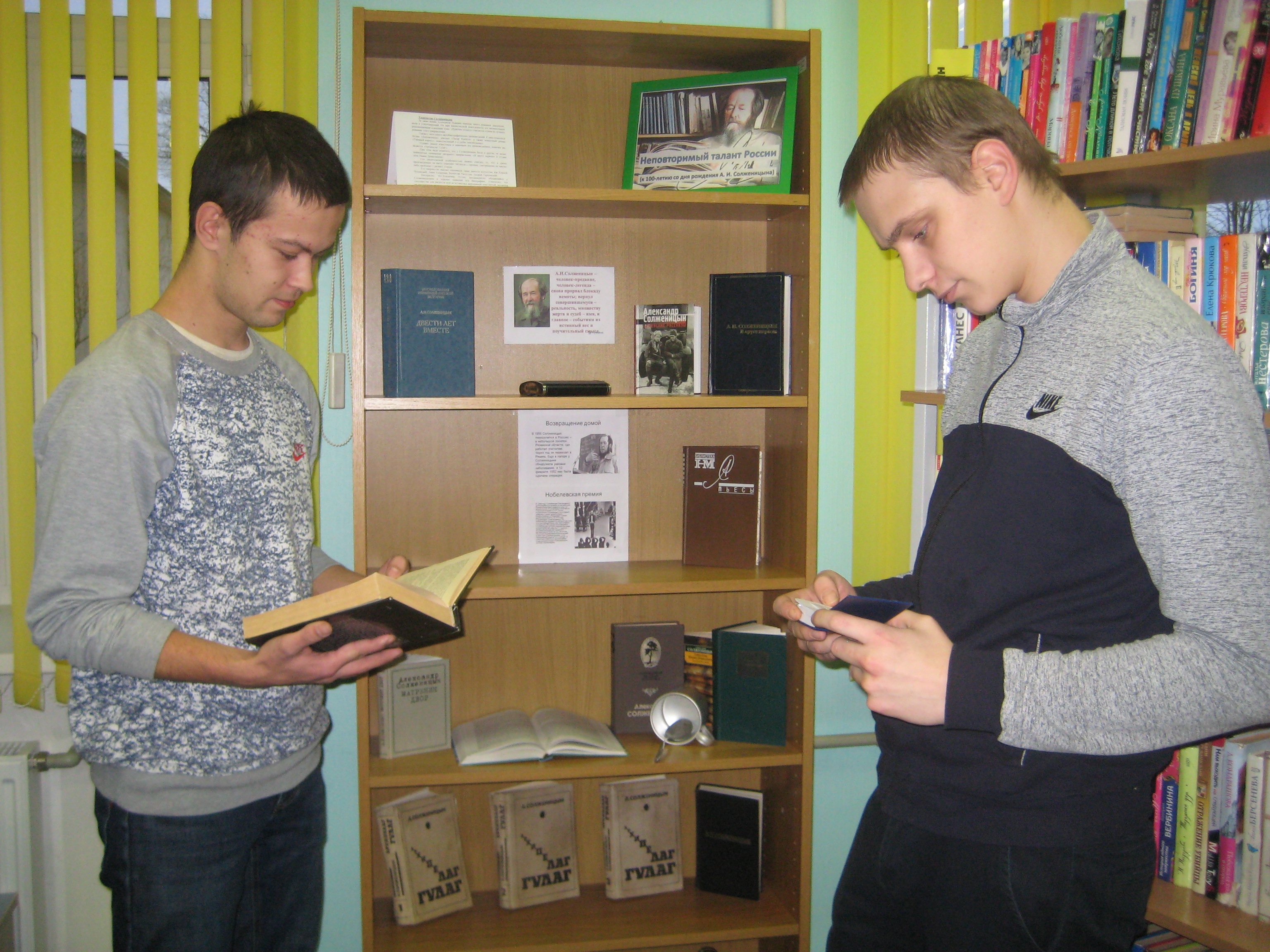 Выставка в школьной библиотеке «Легенда и беспокойная совесть России» (СОШ №11 г. Мурманска) привлекла внимание ребят 5-9-х классов. Для школьников старших классов оформлена книжная выставка «Феномен Солженицына» (п. Молочный). Учащимся 11-х классов и взрослым читателям были представлены экспонаты выставки «Эпоха по имени Солженицын» (ЦГБ г. Оленегорск). На книжно – иллюстративной выставке «Истинный патриот и житель России» (городская библиотека – филиал п. Сафоново) были представлены разные произведения писателя, а также документальные книги, в которых освещены интересные факты из жизни.