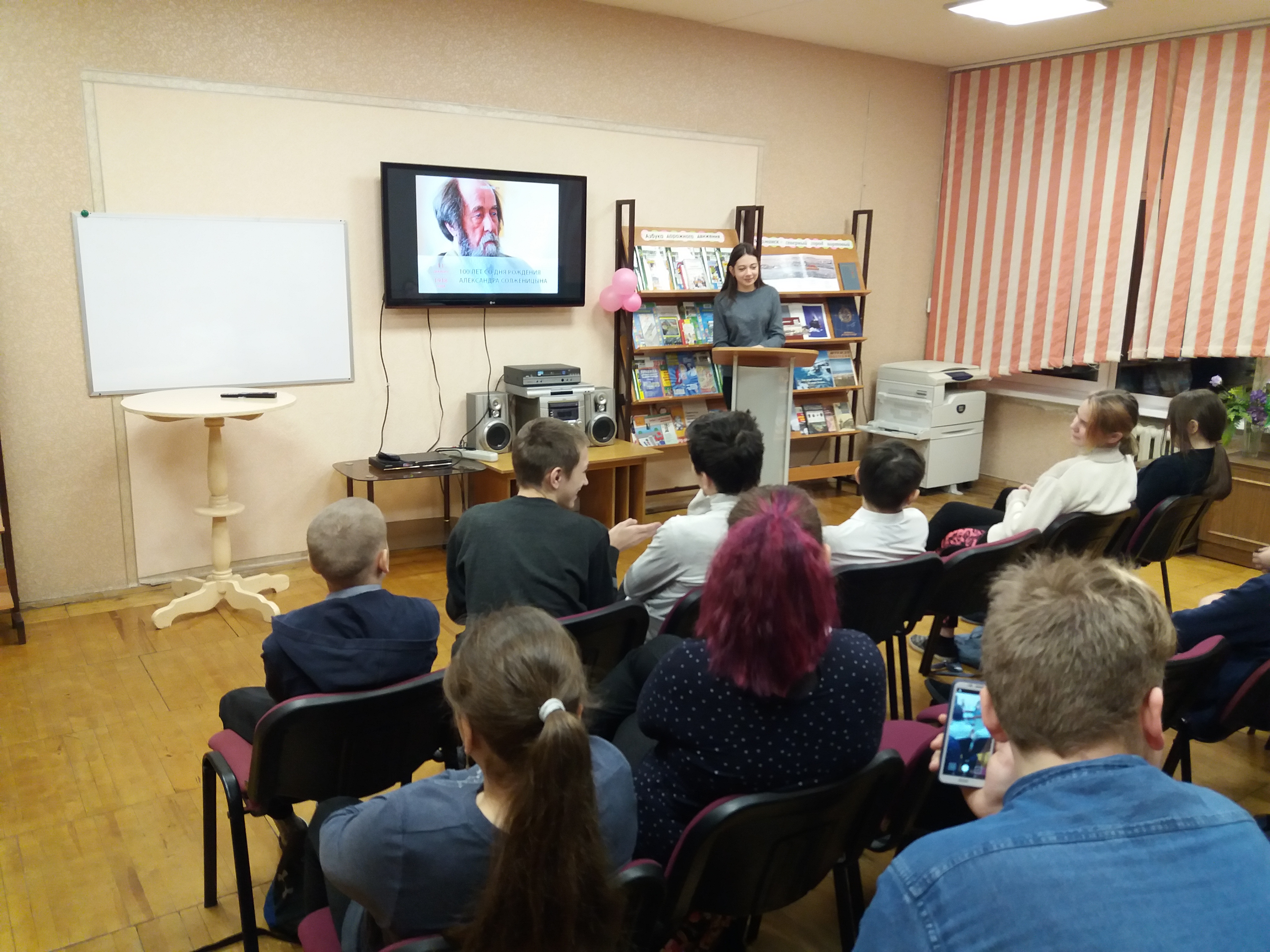 Со школьниками старших классов в детской библиотеке п. Молочный проведена беседа у выставки, где старшеклассники познакомились с нелёгкой судьбой и творчеством русского писателя, поэта, драматурга. После беседы слушатели просмотрели отрывок из репортажа об открытии памятника Солженицыну в Москве. Увлекательная беседа о жизни и творчестве великого русского писателя была проведена в городской библиотеке-филиале п. Сафоново для учащихся 9-11 классов. В завершении беседы ребятам был зачитан отрывок из рассказа «Матрёнин двор». Участники поделились своим впечатлением и высказали мнение об одиночестве и помощи пожилым людям