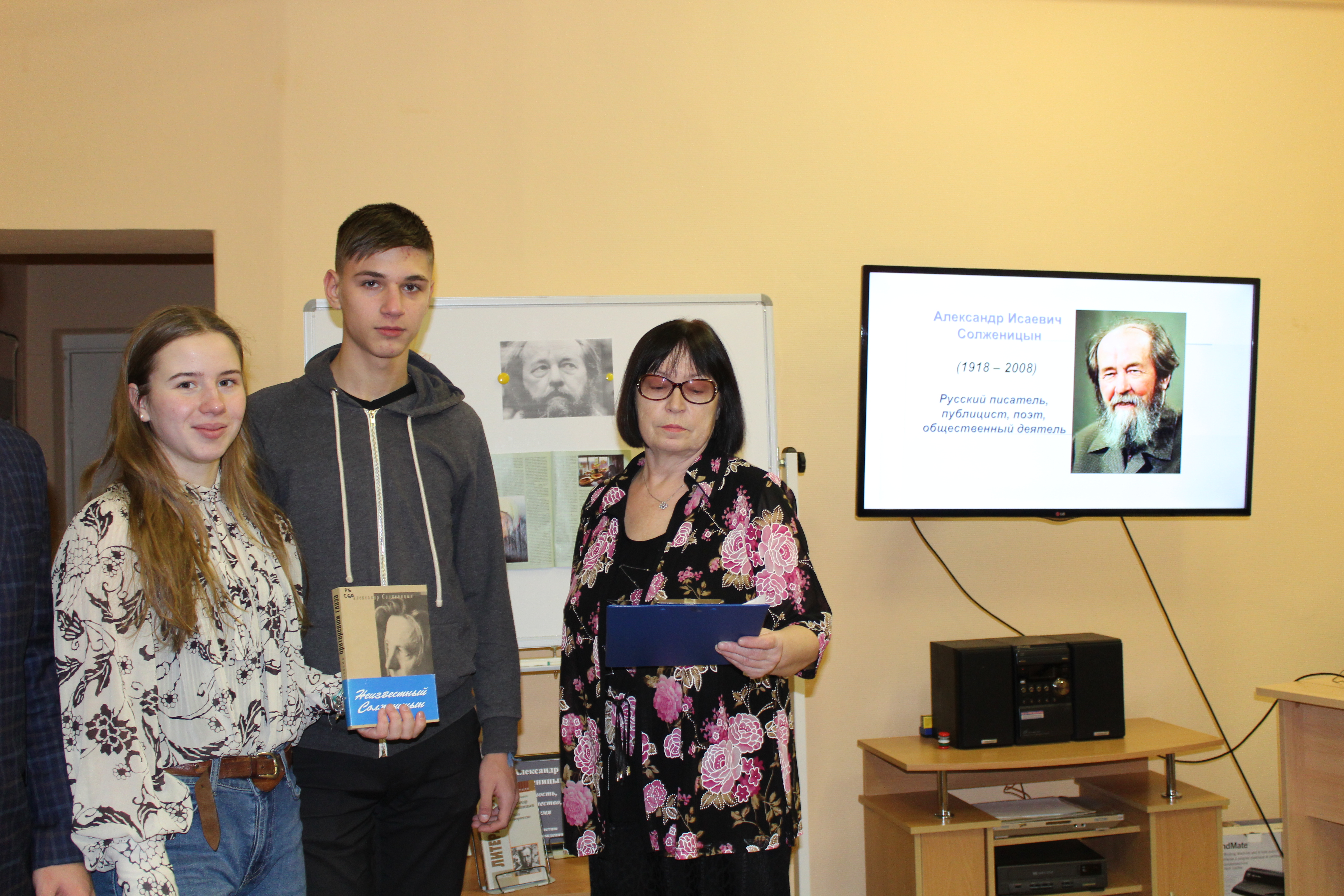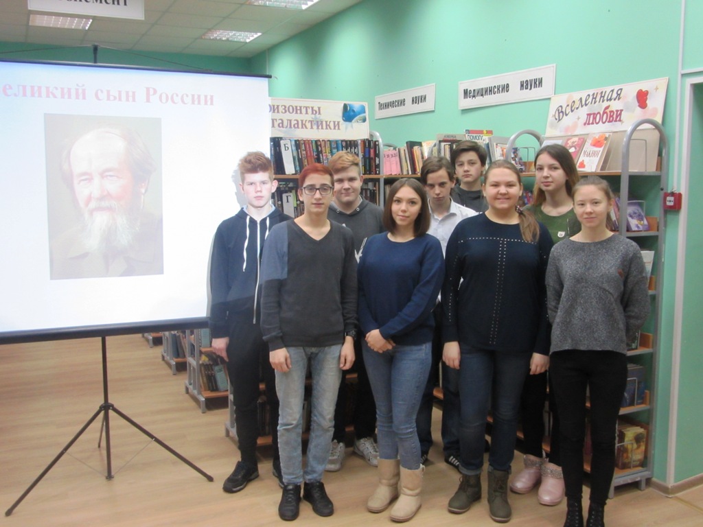 В сельской библиотеке-филиале п. Териберка Кольского района состоялся литературный вечер «Великий сын России», посвященный 100-летию А. И. Солженицына. С интересом посетители библиотеки посмотрели электронную презентацию «Великий сын России». Прозвучали отрывки из произведений А.И. Солженицына: «Один день Ивана Денисовича», «Матренин двор». Завершилось мероприятие просмотром отрывка из документального фильма памяти А. И. Солженицына «Слово».