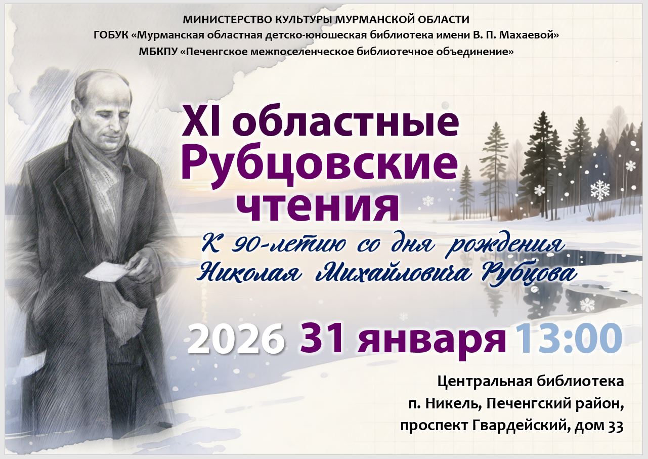 В целях сохранения и развития книжных просветительских традиций региона в рамках проекта поддержки детского и юношеского чтения "К.И.Т." пройдут ХI областные Рубцовские чтения в Мурманской области. В 2026 году Они проводятся Мурманской областной детско-юношеской библиотекой имени В.П. Махаевой совместно с Печенгским межпоселенческим библиотечным объединением.