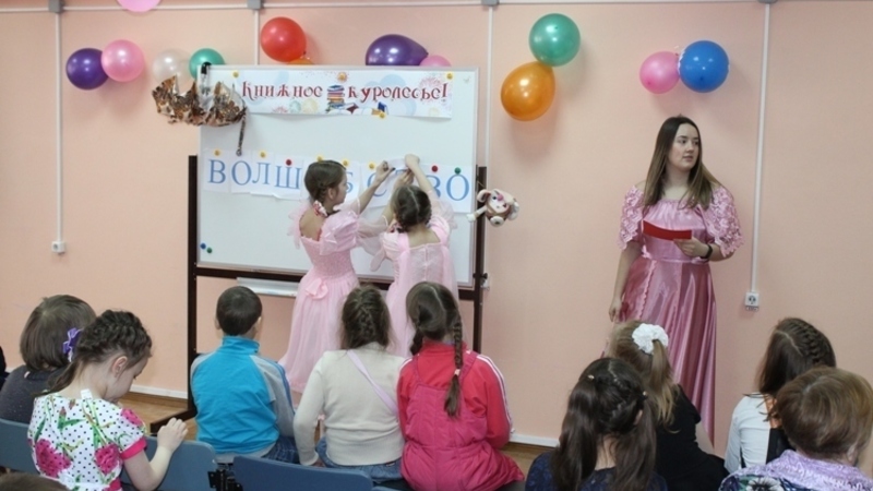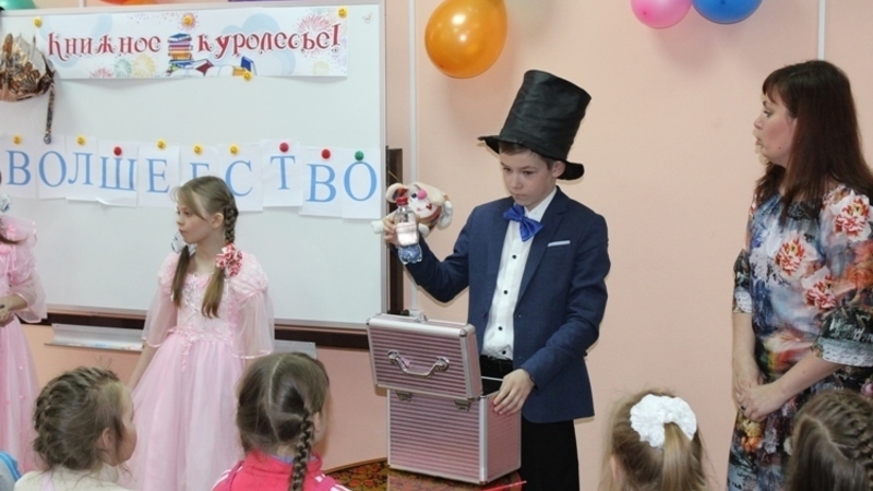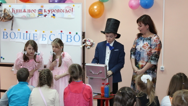 Сотрудники библиотеки вместе с детьми подготовили веселое театрализованное представление по книге Виталия Губарева «Королевство кривых зеркал». Маленькая девочка Оля попадает в сказочное королевство, в котором всё наоборот. Там делают кривые зеркала, добрые становятся злыми, красивые превращаются в страшилищ. Оля встречается с девочкой Яло – своим отражением. Выбраться из Королевства непросто. Девочкам надо разгадать одно-единственное слово и найти ключ от сказочных ворот. Для этого на помощь приходят помощники: добрая тетушка Аксал, фея Агинк и, конечно же, все гости праздника. Отвечая на вопросы разных интерактивных викторин, и выполняя веселые задания, ребята получали буквы, из которых смогли сложить слово «Волшебство». После этого в зале появился «фокусник» Гам, он продемонстрировал несколько волшебных фокусов и передал главным героиням ключи, с помощью которых они смогли вернуться домой.