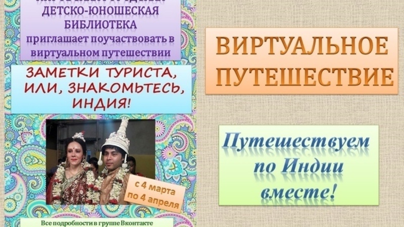 Городская детско-юношеская библиотека-филиал №1 организовала для своих читателей виртуальное путешествие «Записки туриста, или, знакомьтесь, Индия!». Для этого использовали ресурс социальной сети ВКонтакте.