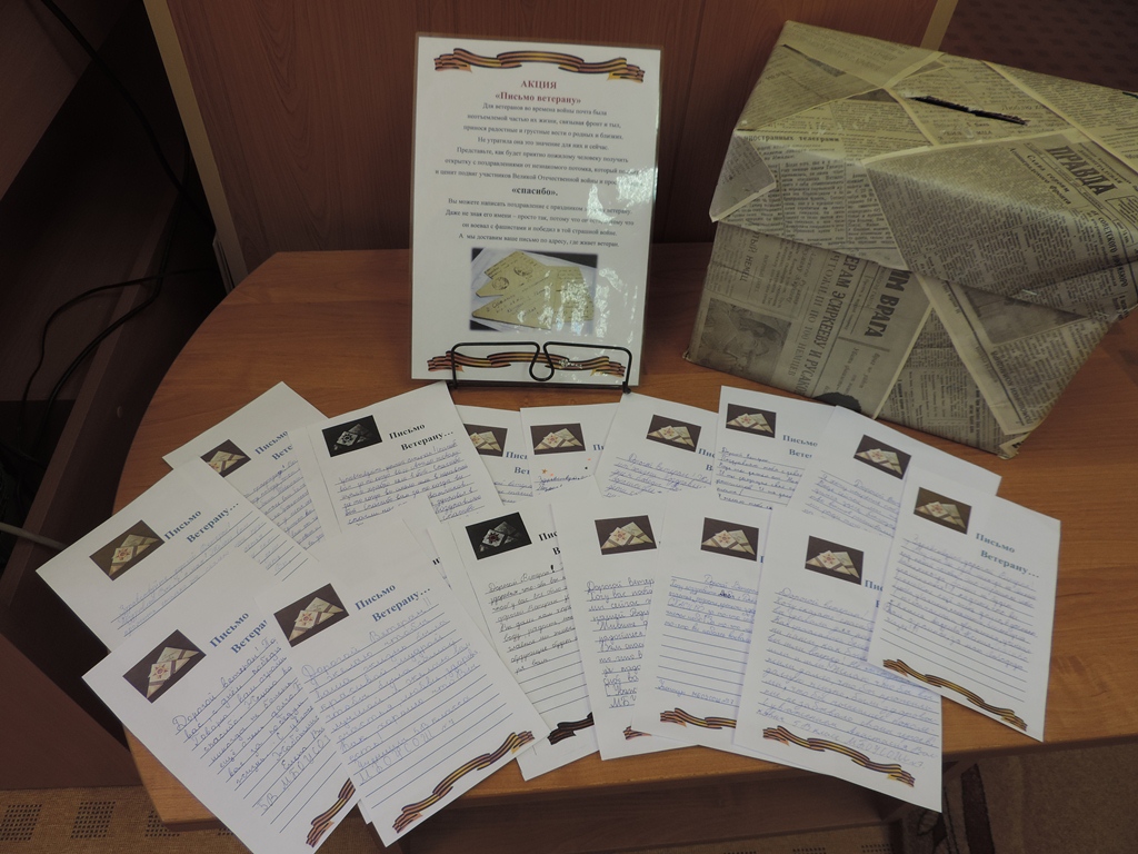 В Центральной детской библиотеке г. Североморска с 2013 года стало традицией в канун Дня Победы проводить акцию «Письмо ветерану». С 20 апреля по 5 мая у школьников была возможность обратиться со словами благодарности к ветеранам, принимавшим участие в Великой Отечественной войне. В ходе проведения акции участникам предлагалось создать обращение в виде письма-поздравления, письма-сочинения, письма-благодарности в адрес участников военных действий, тружеников тыла, детей войны. В этом году ребята написали 74 письма. Письма были написаны от руки и сложены в виде военного треугольника. В 2018 году участники акции присоединились к волонтерам Победы, которые распространяли письма среди ветеранов на праздновании Дня Победы, вручая вместе с письмом георгиевскую ленточку.
