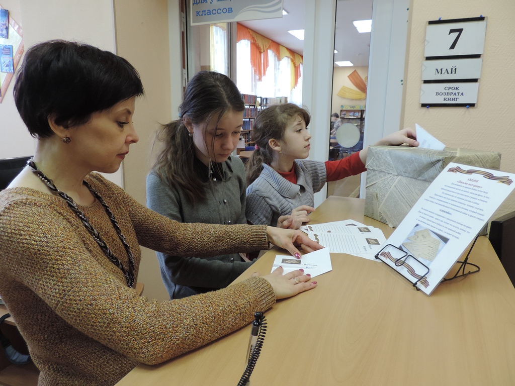В детско-юношеской библиотеке-филиале города Кировска состоялся исторический экскурс «Дорогами военно-полевой почты». В ходе мероприятия прозвучали: знаменитое письмо-песня «В землянке», стихотворение К. Симонова «Жди меня». Учащиеся сами читали военные стихи и прослушали трогательное стихотворение – письмо Эдуарда Асадова, написанное с фронта матери. В конце встречи память о погибших почтили минутой молчания.