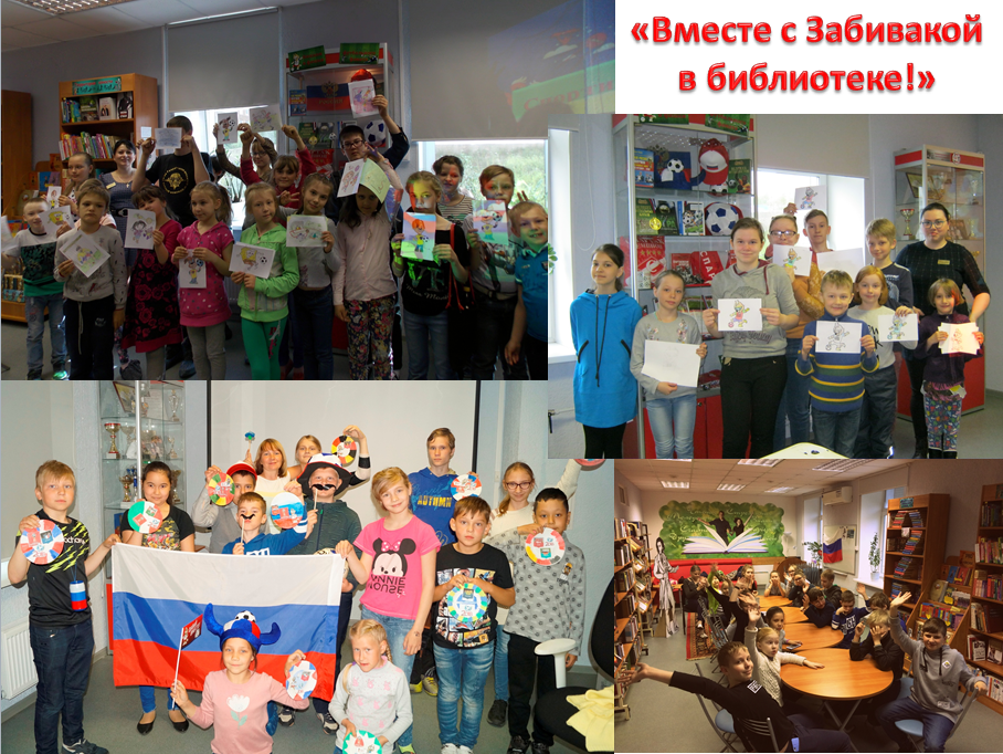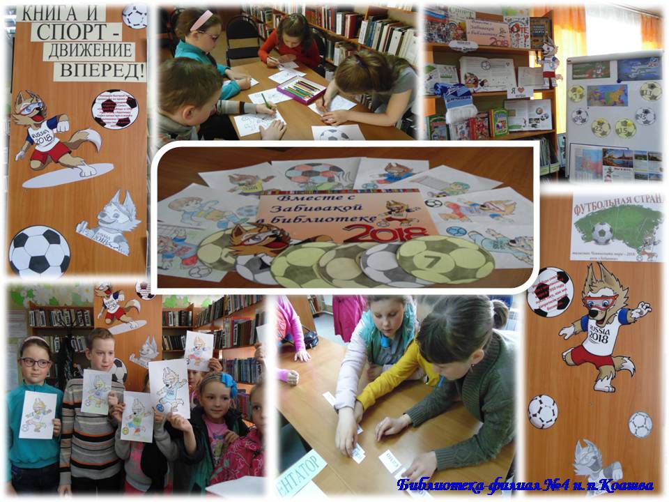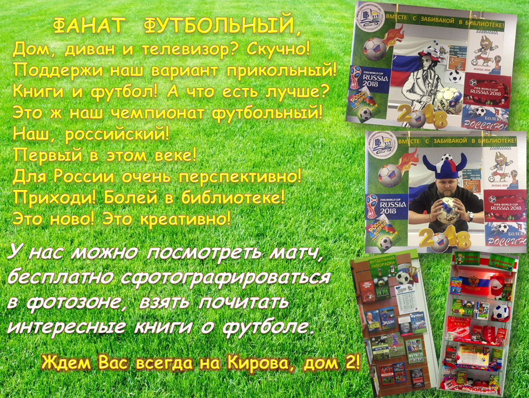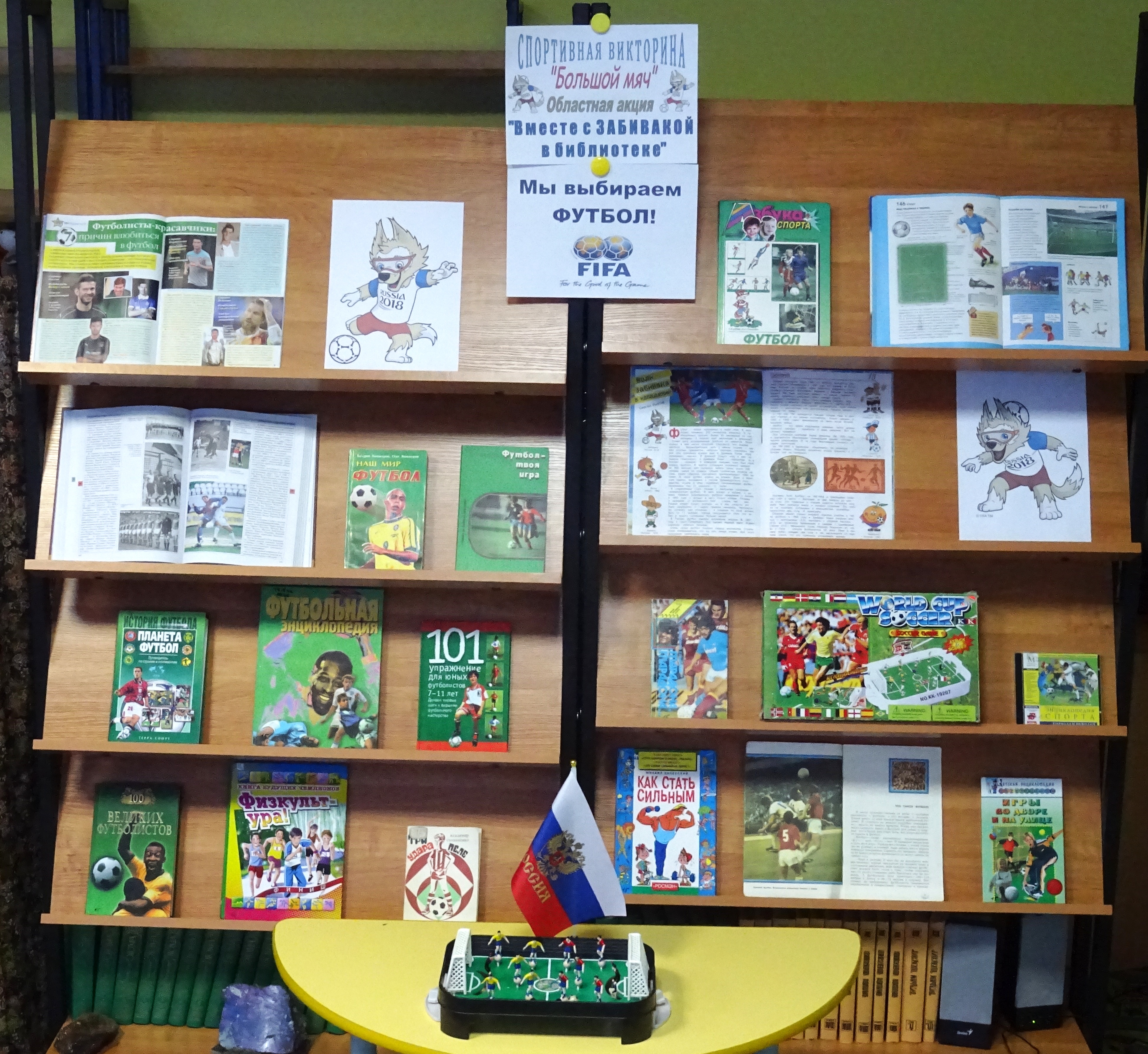 При подготовке к Чемпионату мира по футболу ФИФА – 2018 в библиотеке оформили книжно – предметные выставки «Книжки и фишки футбольного фаната» и «Футбольная лихорадка», фотозону «Вместе с Забивакой в библиотеке!», разработали листовку-приглашение в библиотечную фанзону со стихами поэта Михаила Зверева.